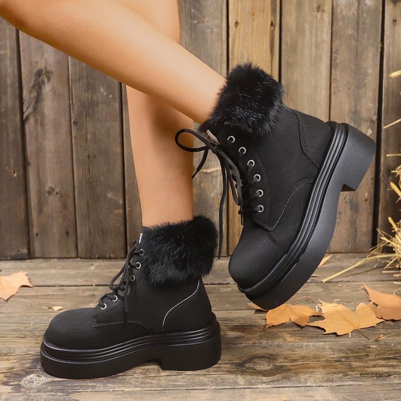 2024 Зимние Горячие Продажи Высокое Качество Женская Обувь Однотонная Круглый Носок Высокий Каблук Шнуровка Короткое Голенище Женские Модные Ботинки — купить товар онлайн с бесплатной доставкой по всему миру!