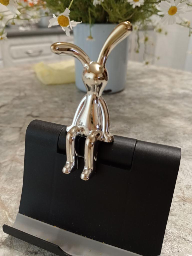 Милейший зайчик))) сделан из пластмассы ,но покрашен под металл.Размер маленький,на фото видно.Я их купила два разных,теперь они живут у меня на углу телевизора.К кролику прилагается кусочек двустороннего скотча,чтобы зафиксировать его на поверхности.