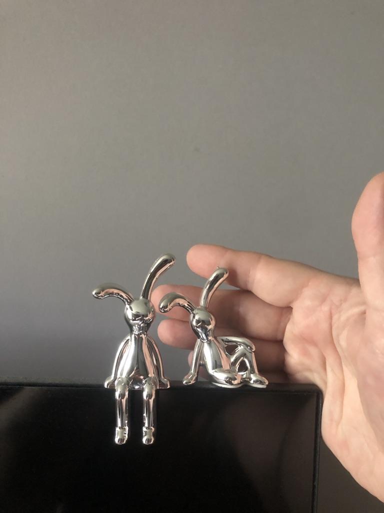 Зайчики пришли все целые, упаковка хорошая, стикеры на месте. Но один из зайчиков почему-то наполовину золотистый, хотя должен был быть полностью серебристым. А так зайчики прикольные, забавные!