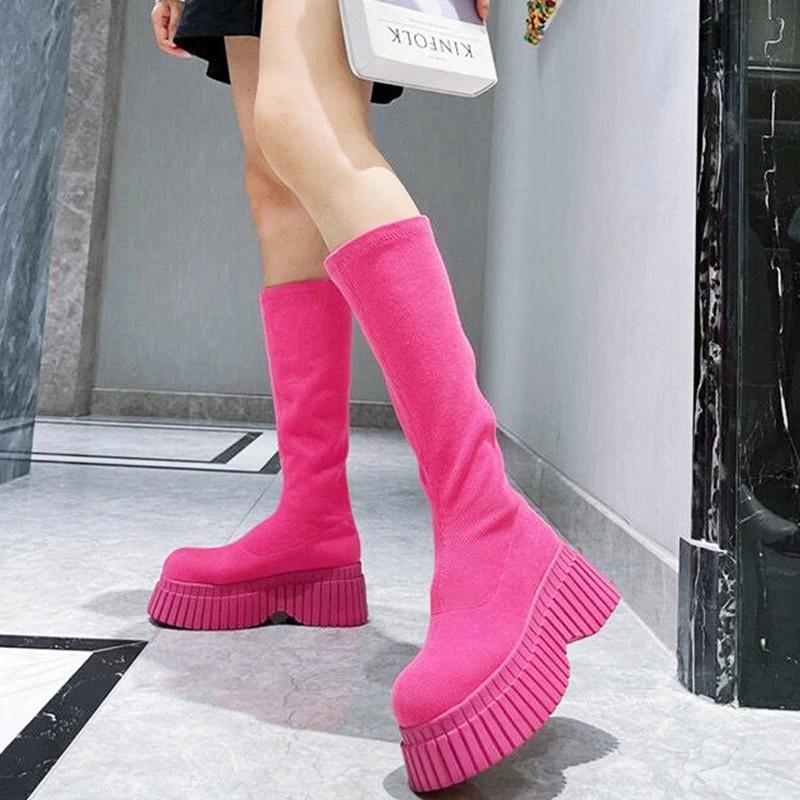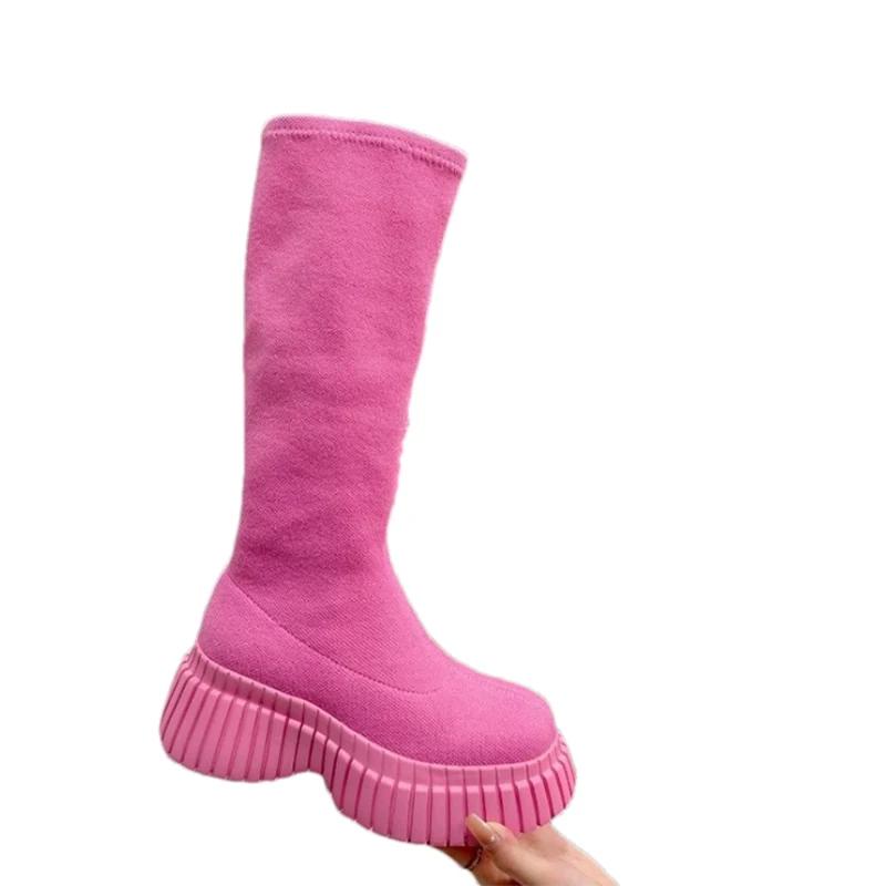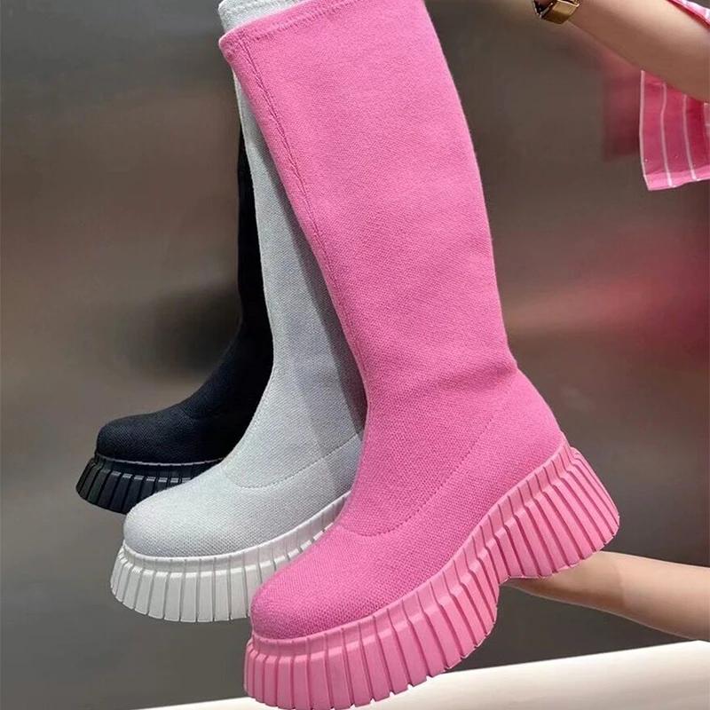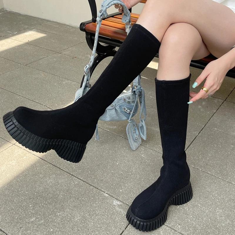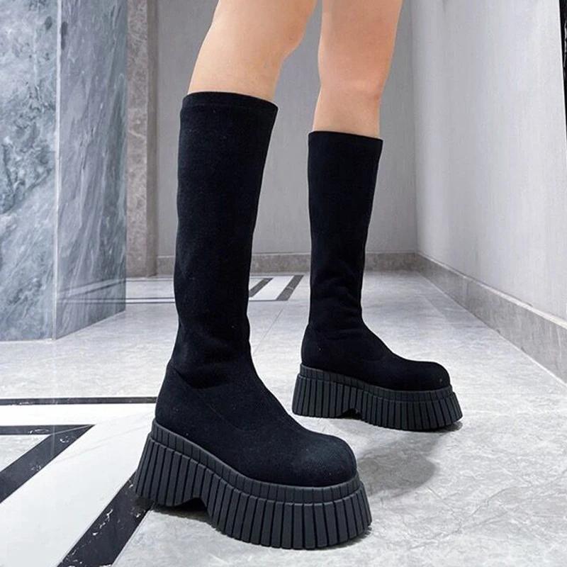 Женские сапоги челси до колена, туфли на танкетке и платформе, зимняя дизайнерская новая модная обувь для ходьбы 2024 года, трендовое платье, женские туфли