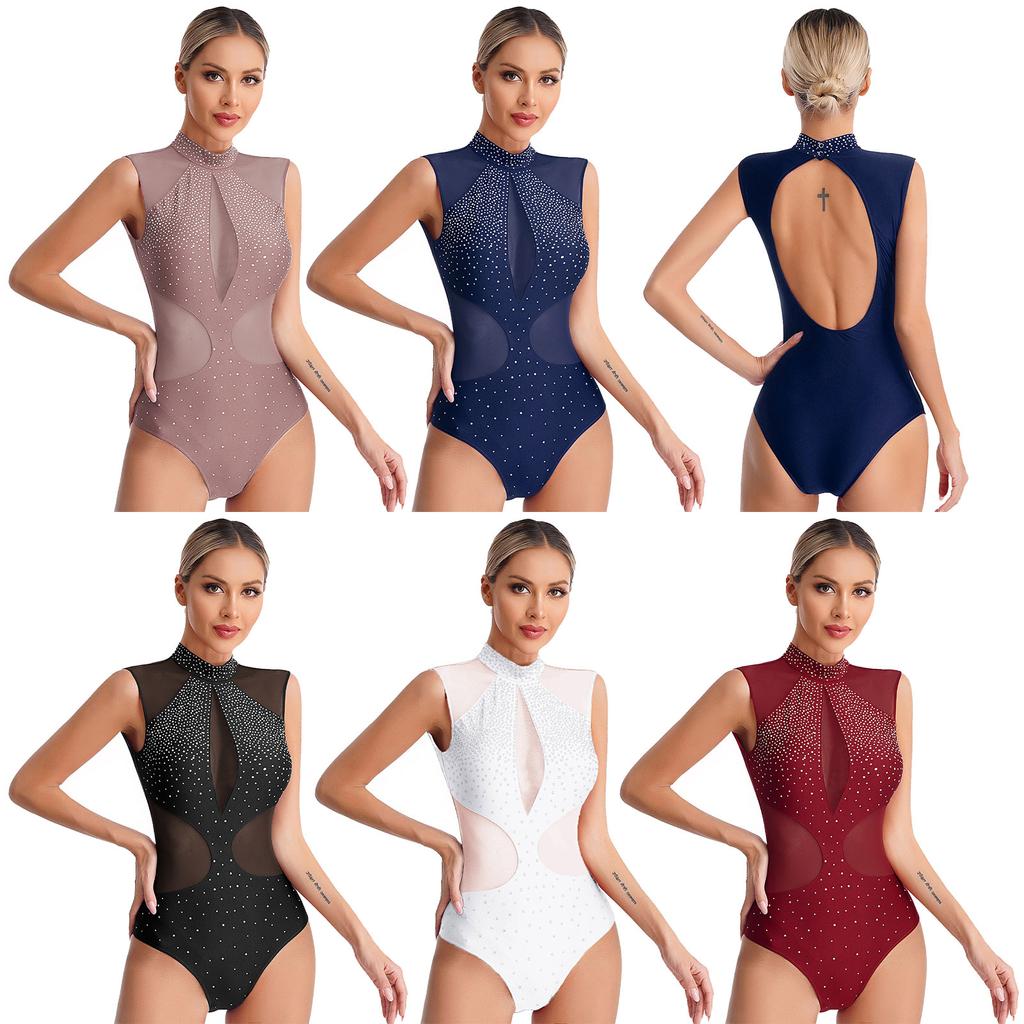 Женский купальник с блестящими стразами для фигурного катания, прозрачный сетчатый лоскутный боди без рукавов с вырезом сзади для гимнастических танцевальных представлений
