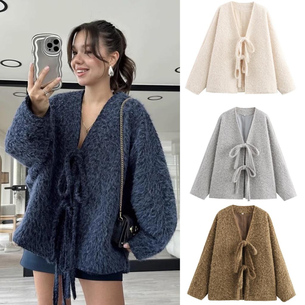 2024 новая осенне-зимняя женская одежда темперамент универсальный V-образный вырез с длинными рукавами шнуровка кардиган свободный плюшевый фактурный жакет топ