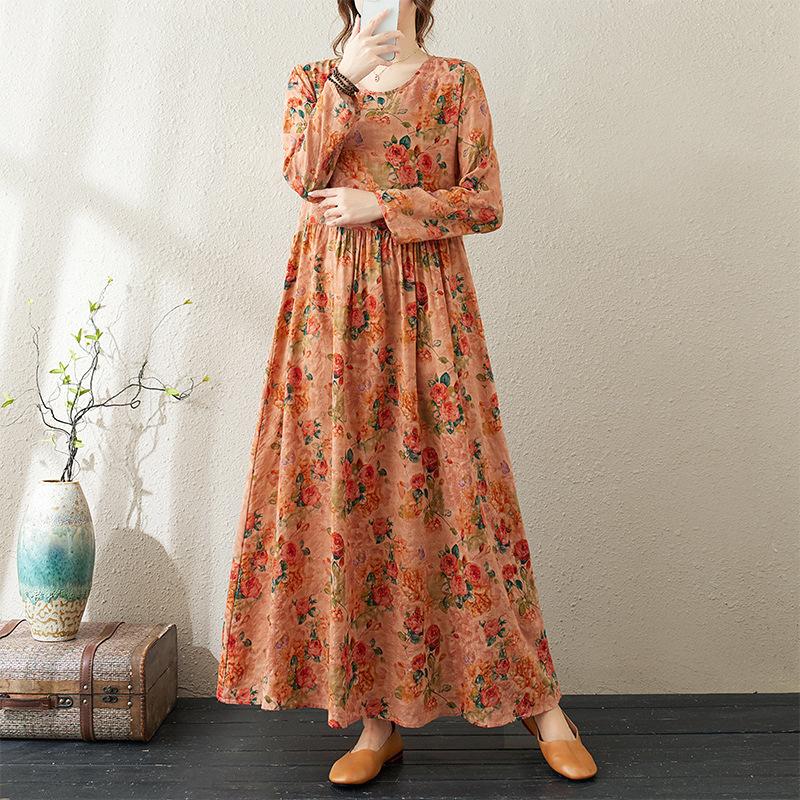 Платье из хлопка и льна ранней осени в стиле ретро, свободное, в туристическом стиле, с круглым вырезом и средней длиной для женщин
