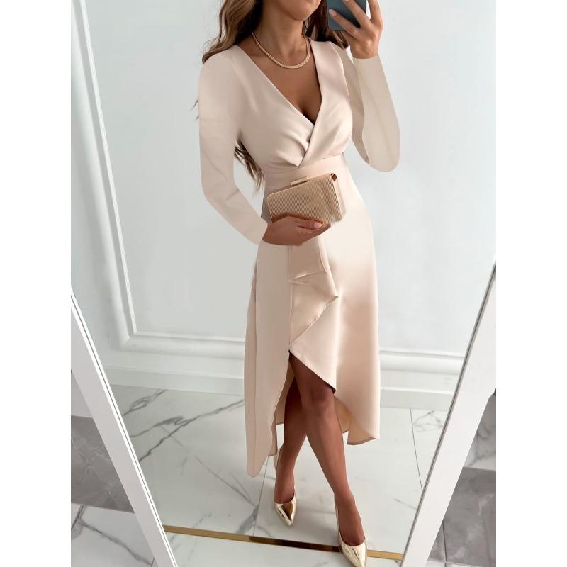 Платье осень-зима с длинными рукавами, V-образным вырезом, плиссированным подолом и разрезом для женщин