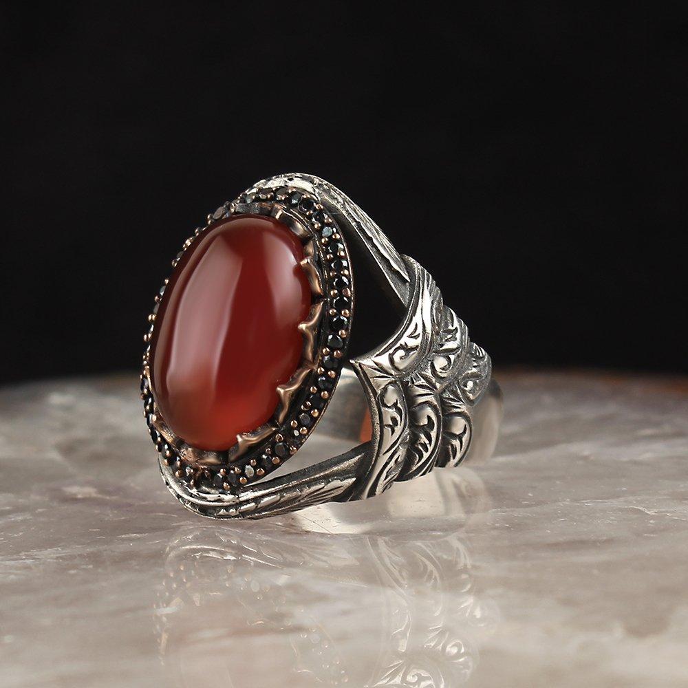 Kırmızı Akik Taşlı Kalem İşçilikli 925 Ayar Gümüş Erkek Yüzük