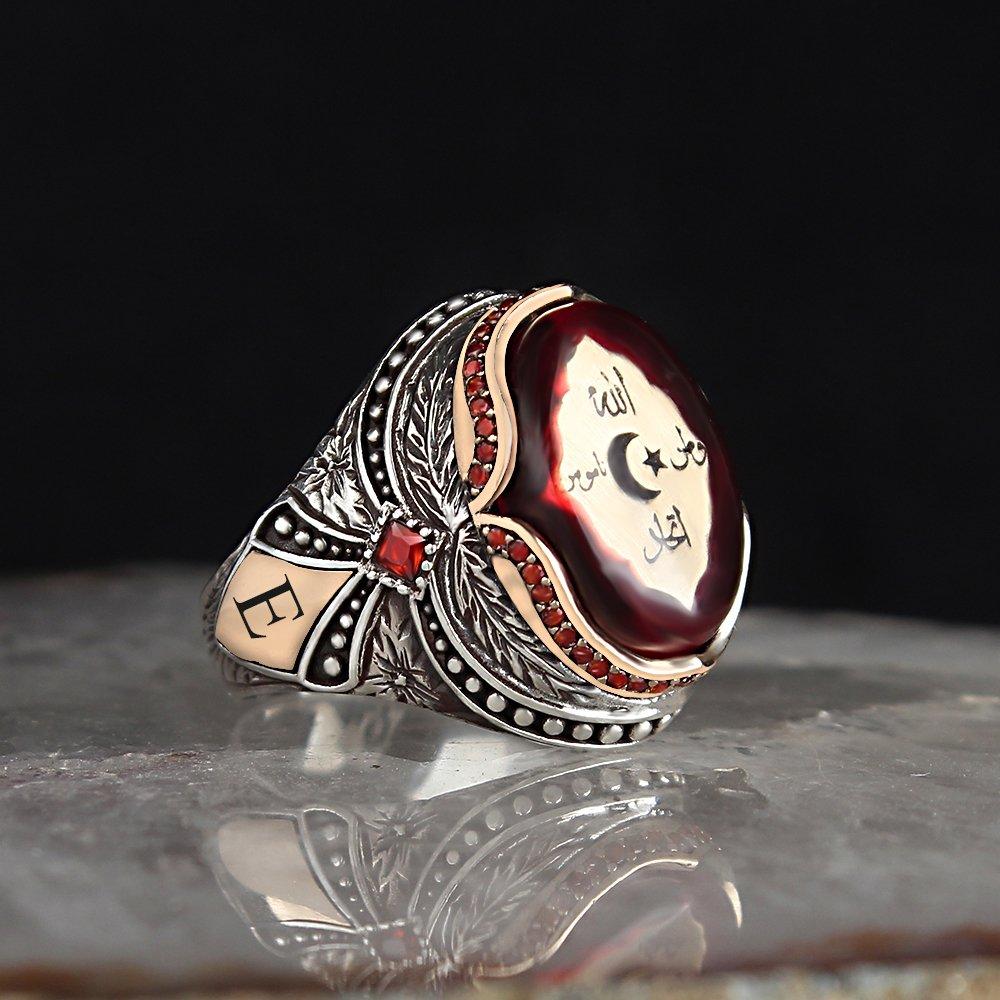 Harfli Kehribar Taşlı Osmanlı Savaş Sancağı 925 Ayar Gümüş Yüzük