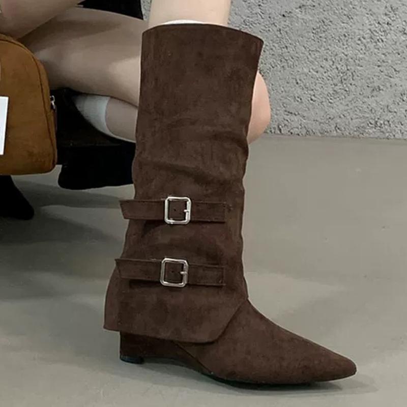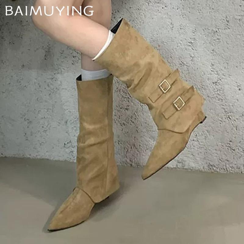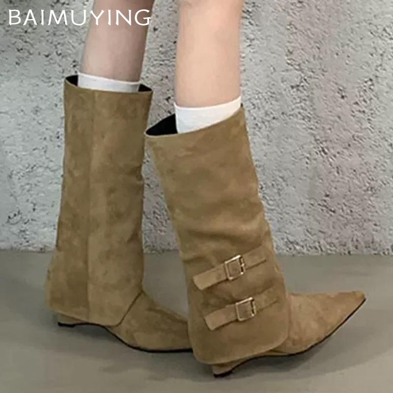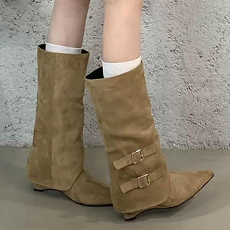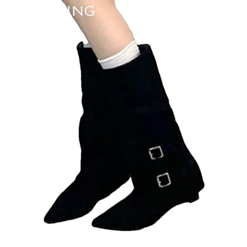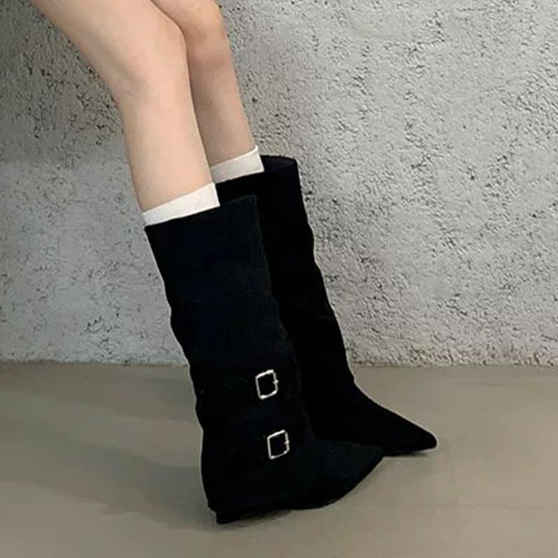 Замшевые женские высокие сапоги с острым носком, модные новые туфли на среднем каблуке 2025 года, дизайнерские сапоги средней длины для зимы в готическом стиле Botas De Mujer