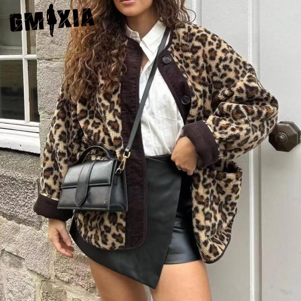 GMXIA Женские винтажные повседневные куртки и пальто с леопардовым принтом на осень-зиму с длинным рукавом и круглым вырезом