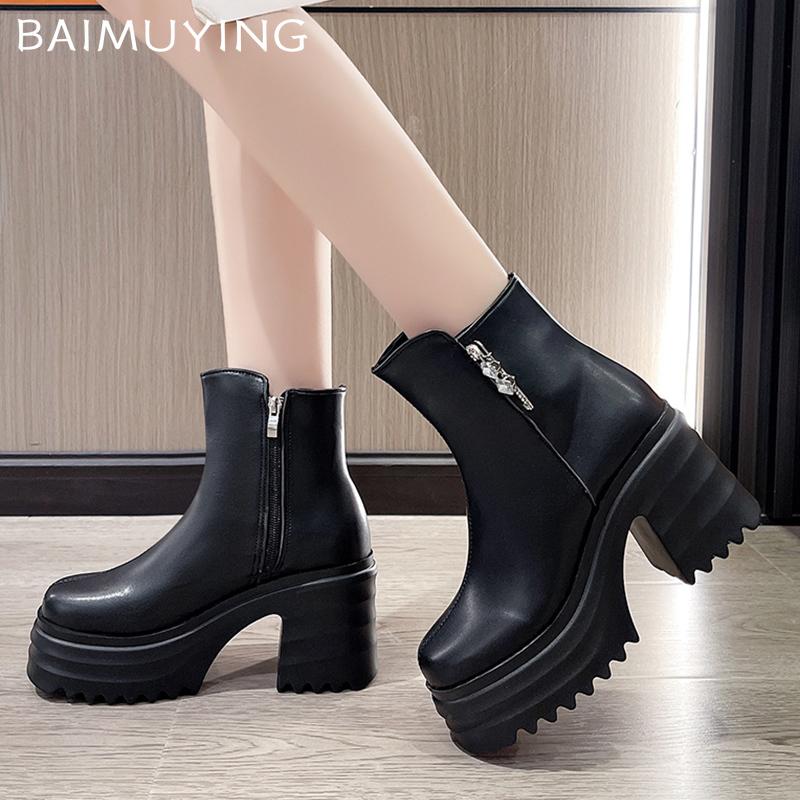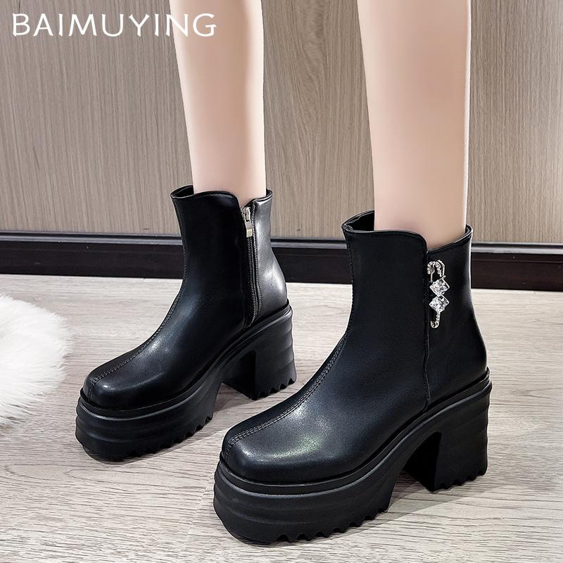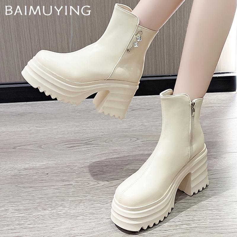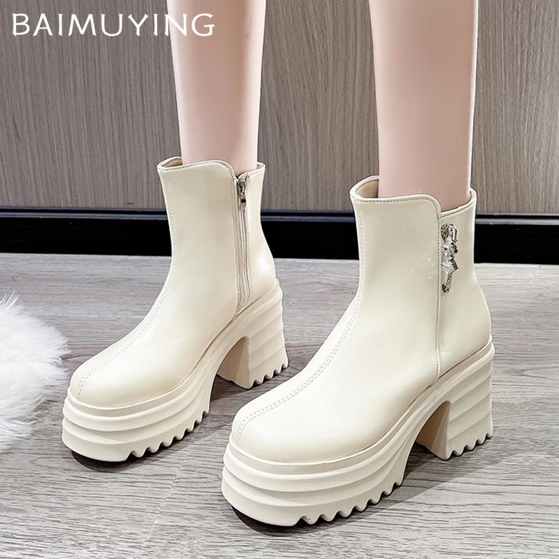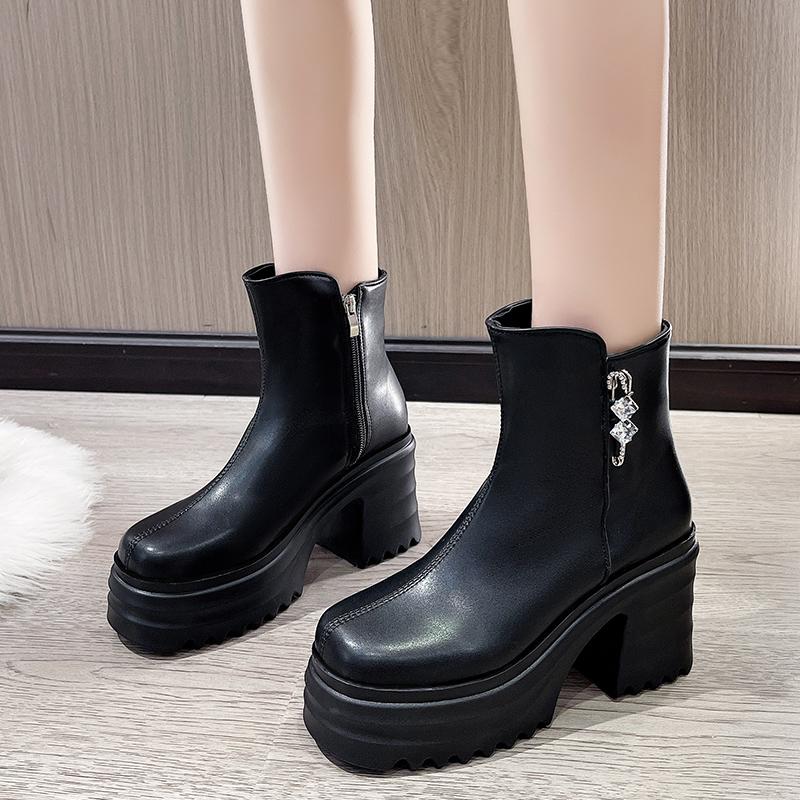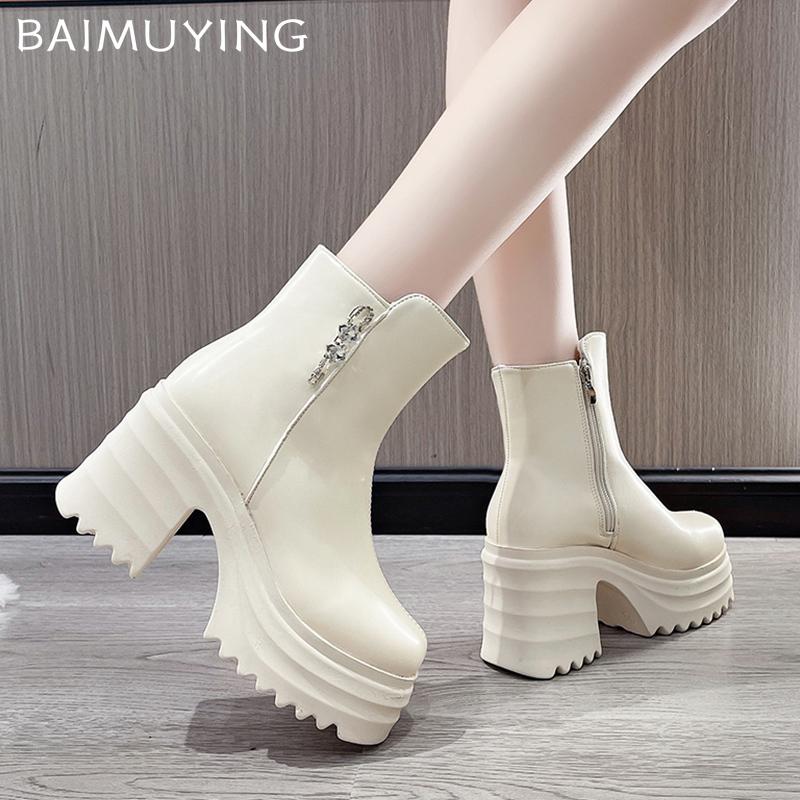 Платформа Женские Ботильоны Кристалл Кожа Высокий Каблук Модная Обувь Дизайнерские Мотоциклетные Ботинки Тренд 2025 Массивные Туфли Botas Mujer