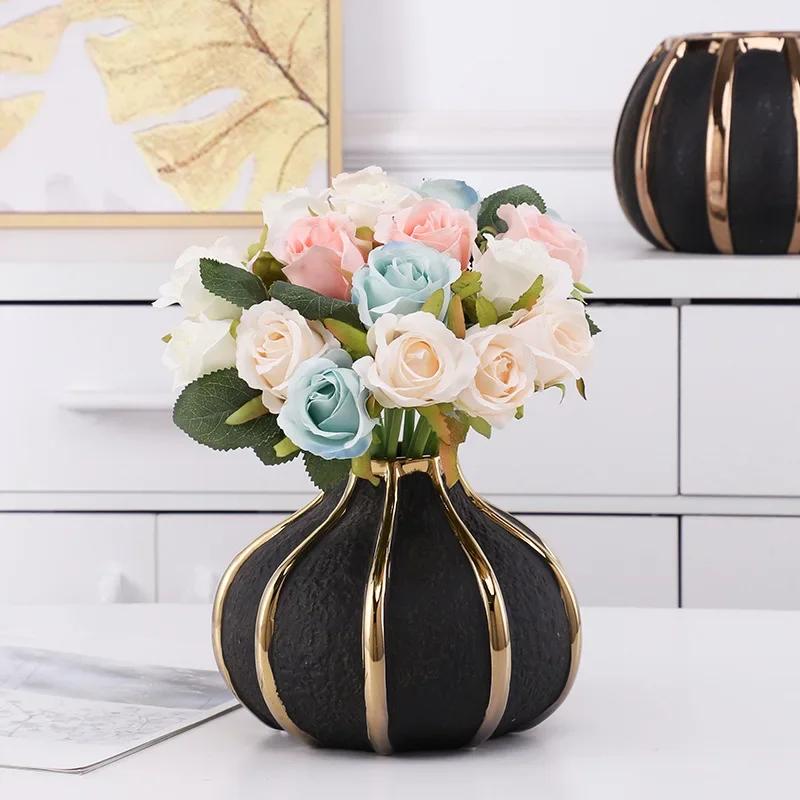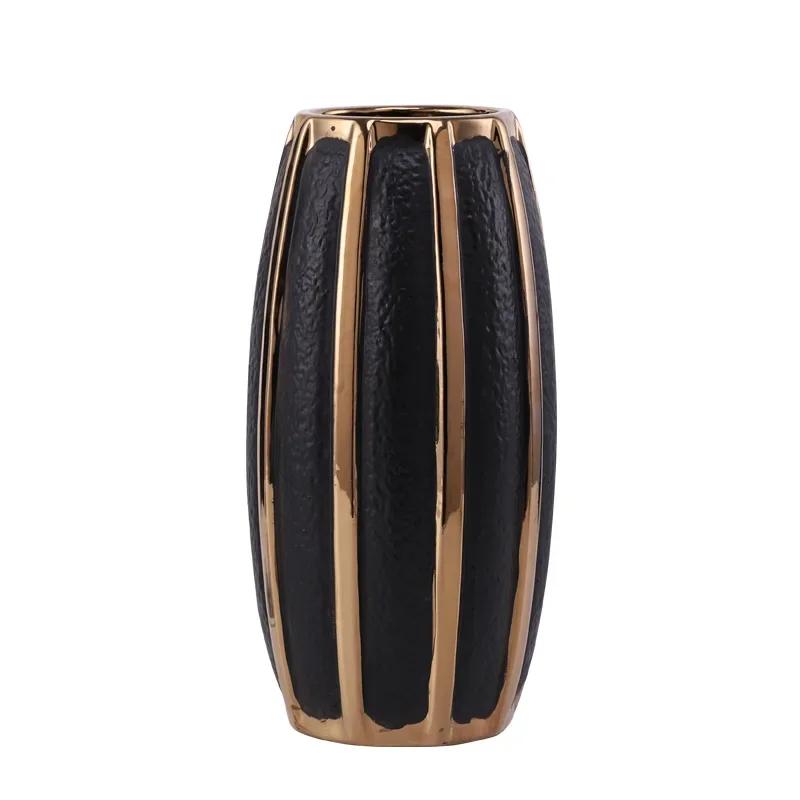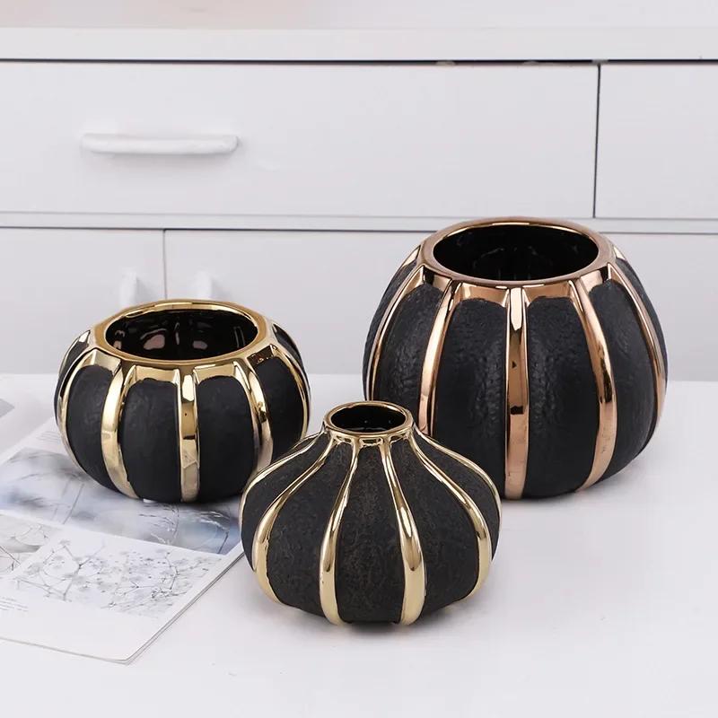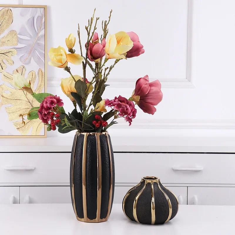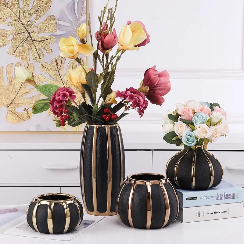 Креативные черные керамические вазы с золотыми полосками Современные цветочные горшки Декоративная цветочная композиция Украшение стола Позолоченные вазы