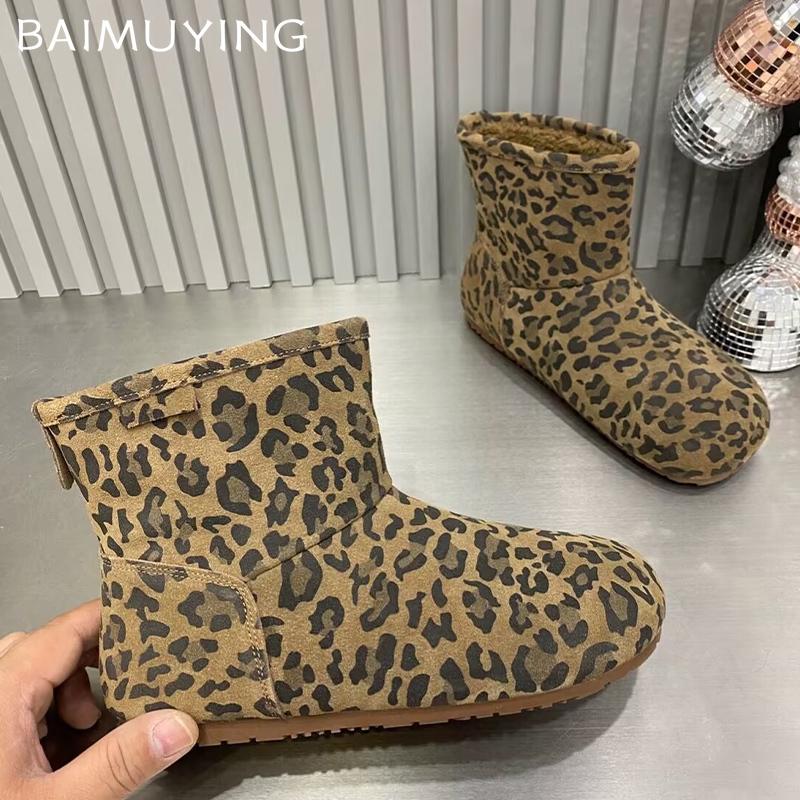 Женские зимние ботильоны на плоской подошве из леопардовой замши с короткими плюшевыми зимними хлопковыми ботинками 2025 года, дизайнерские теплые повседневные удобные ботинки для женщин