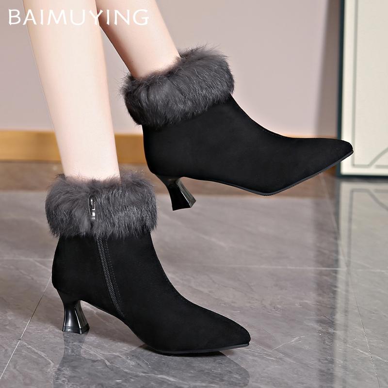 Ботильоны женские меховые замшевые с острым носком на высоком каблуке дизайнерская обувь 2025 года тренд новый бренд модные зимние туфли-лодочки готические Botas De Mujer