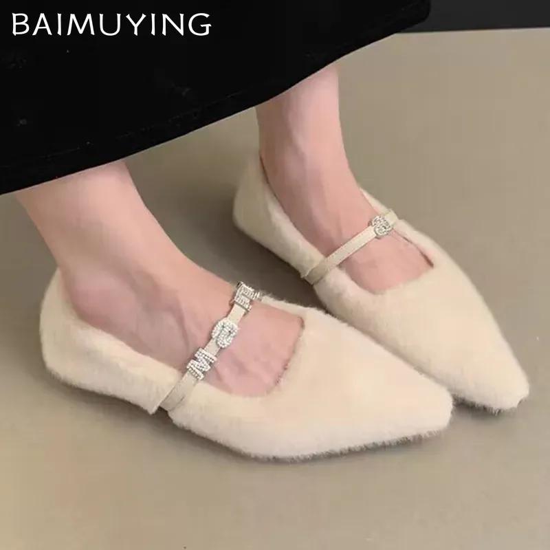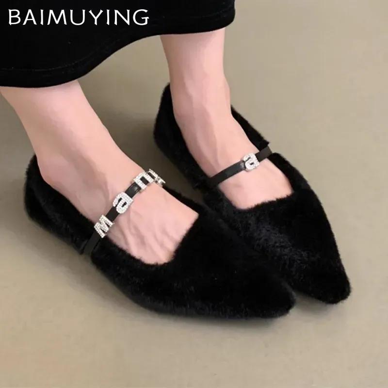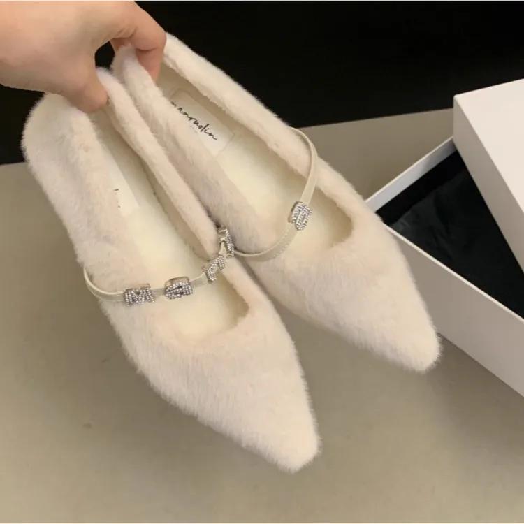 Меховые туфли на плоской подошве с острым носком, теплые элегантные мокасины, женская обувь 2025 года, тренд зимы, мода, повседневные неглубокие балетки