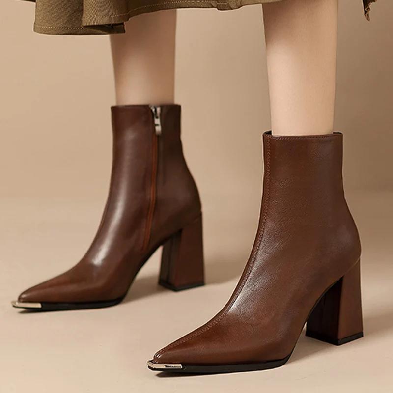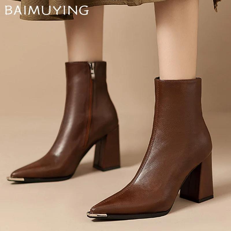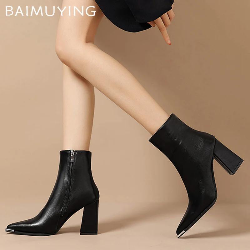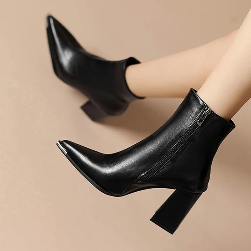 Женские зимние ботильоны с острым носком, кожаные сексуальные туфли на высоком каблуке, массивные модные туфли-лодочки, тренд 2024 года, дизайнерские зимние ботинки челси