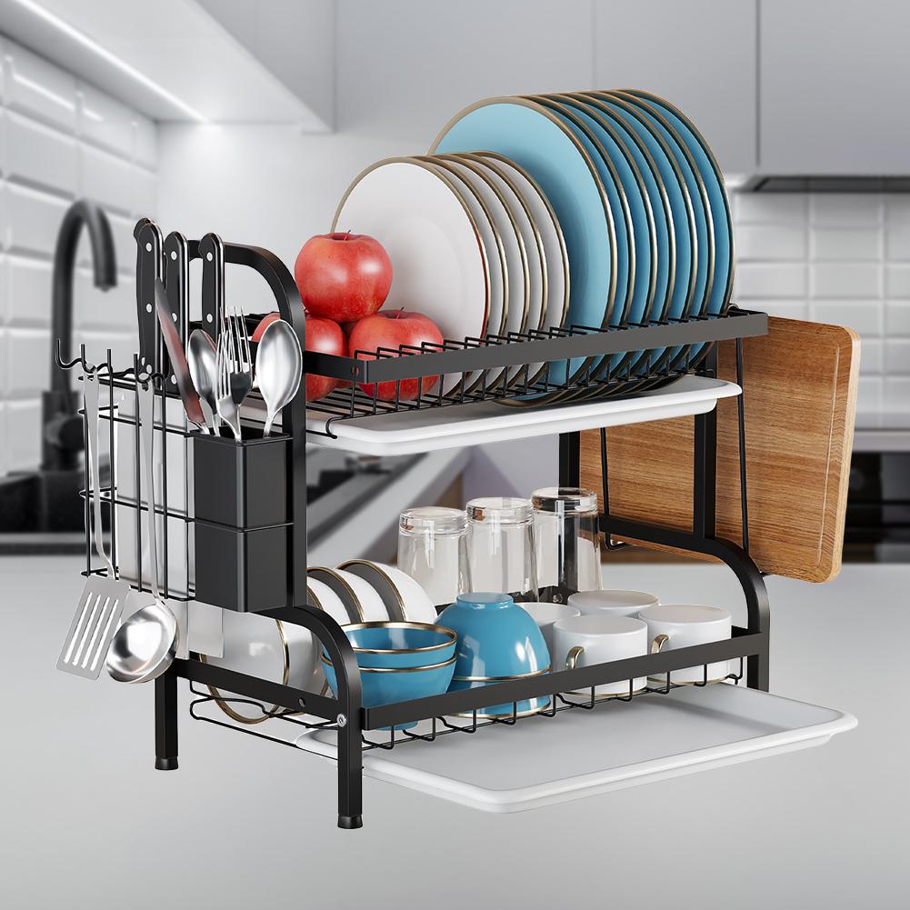 Двухъярусная сушилка для посуды с сушилкой для посуды, большая вместимость, хозяйственный поднос, корзина, экономящая место на небольшой кухонной столешнице