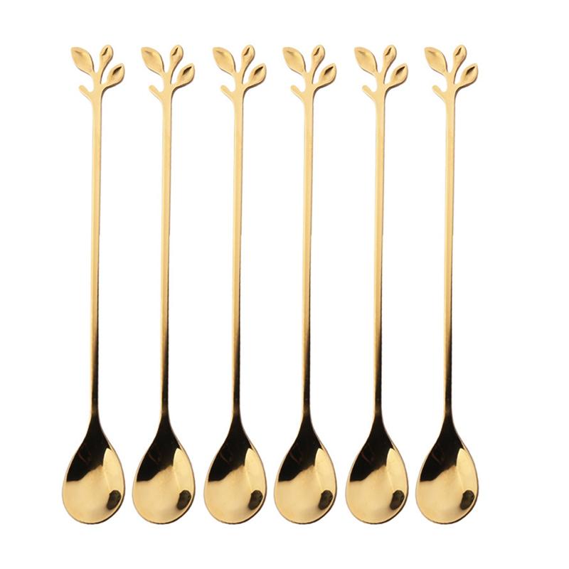 6 шт. Творческая личность Нержавеющая сталь Золотые ложки Дерево Лист Ложка Кофейная ложка Чайная ложка Домашний Ресторан Десерт Столовые приборы Набор
