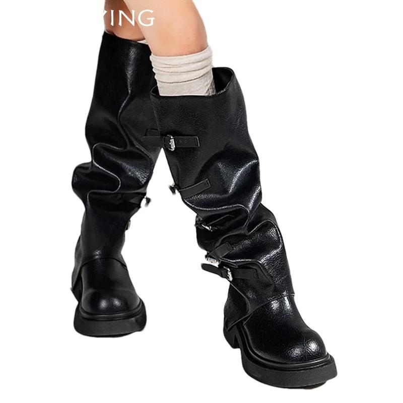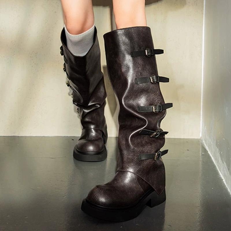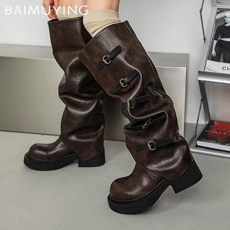 Кожаные массивные модные женские высокие сапоги на среднем каблуке с пряжкой дизайнерские высокие мотоциклетные сапоги до колена зима 2024 трендовые ботинки женские