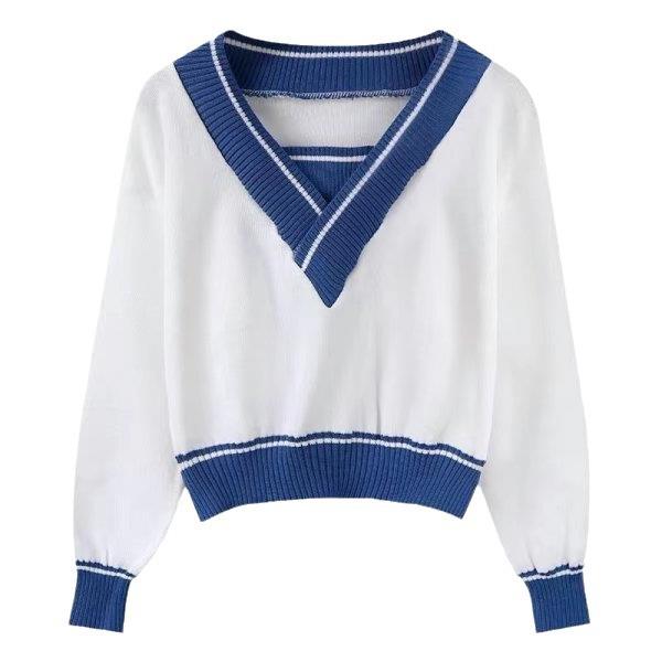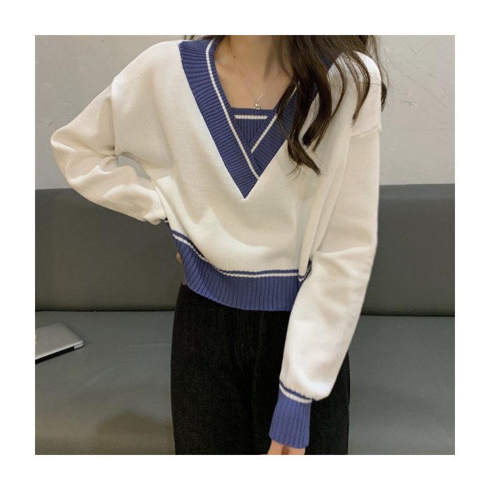 Поддельная рубашка из двух частей с V-образным вырезом контрастного цвета, трикотажная нижняя часть, весеннее и осеннее пальто с узким свитером для невысоких женщин, короткий топ