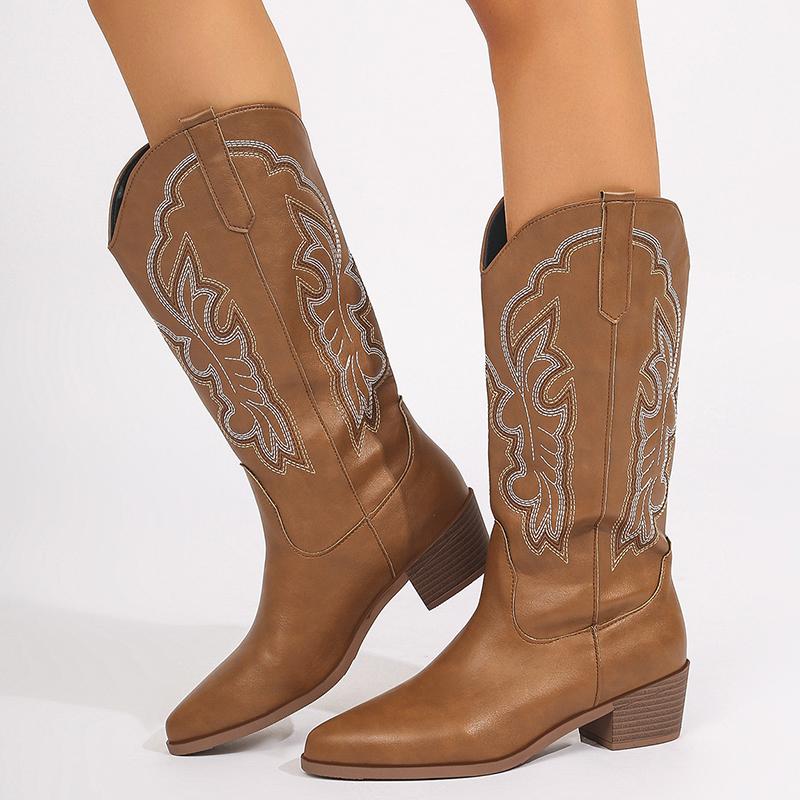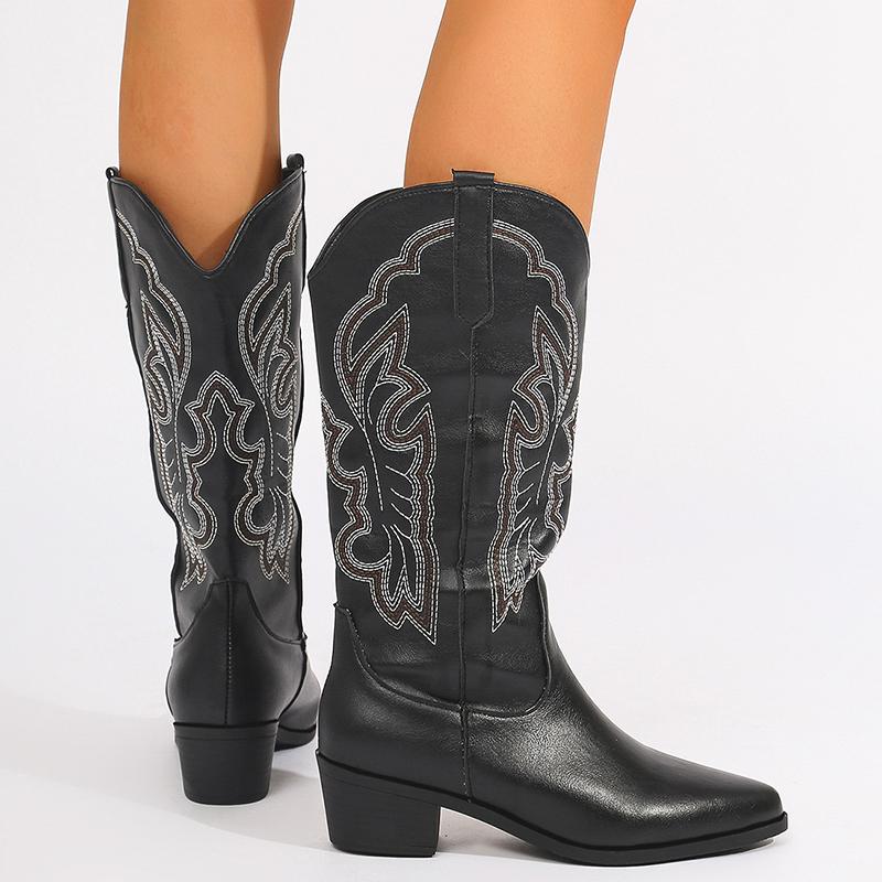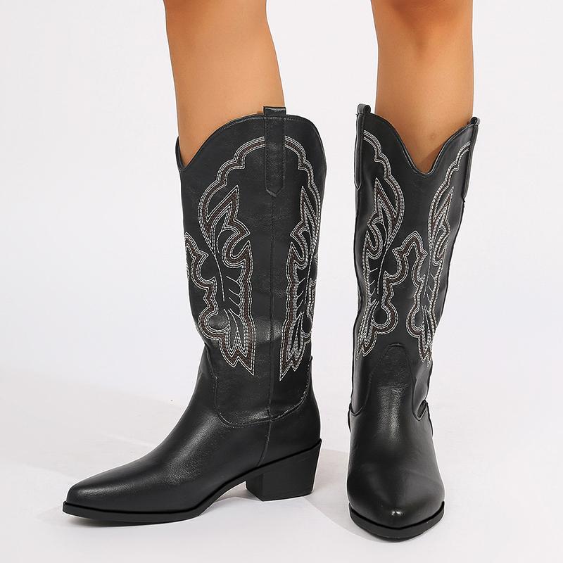 2024 Вышитые сапоги для ковбойши до колена, женские новые трендовые сапоги в стиле вестерн с острым носком, женские сапоги из искусственной кожи для верховой езды 43