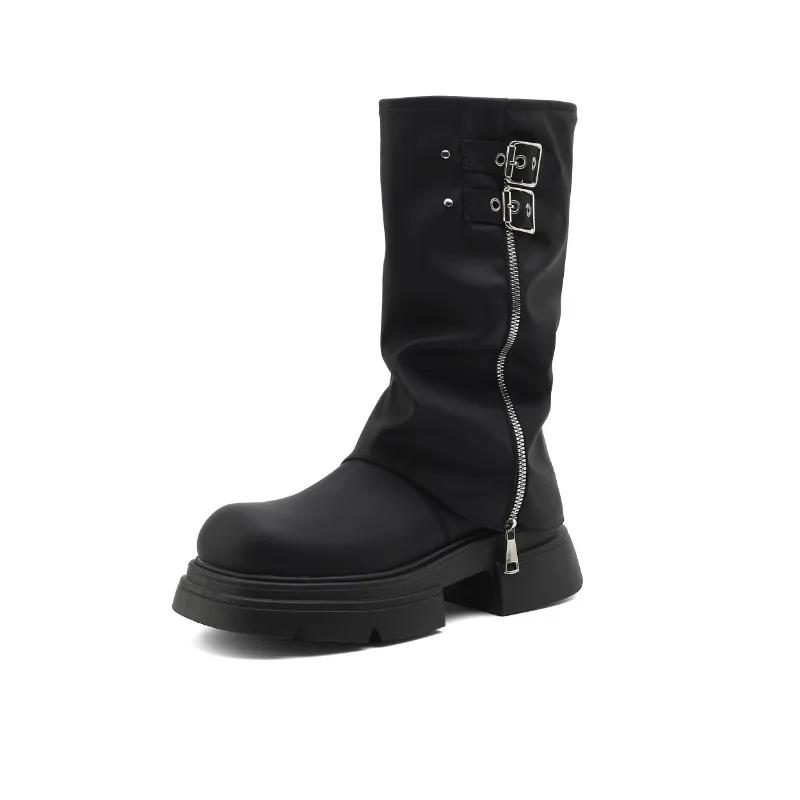 2024 Новая женская обувь, женские ботинки с пряжкой на ремне, модные современные ботинки на молнии с боковой стороны, женские сапоги высокого качества до середины икры с круглым носком