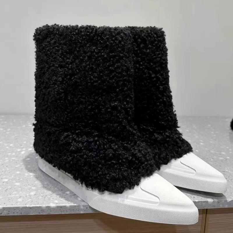 Модные женские ботильоны с острым носком на меху на плоской подошве, дизайнерские плюшевые туфли для женщин, тренд 2025 года, готические ботинки челси, зимние новые женские зимние ботинки