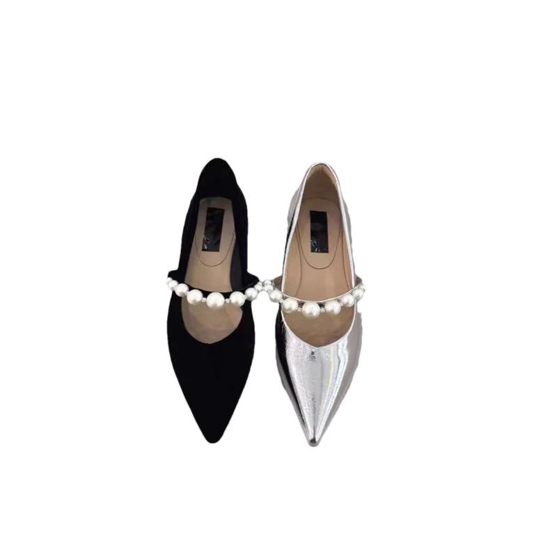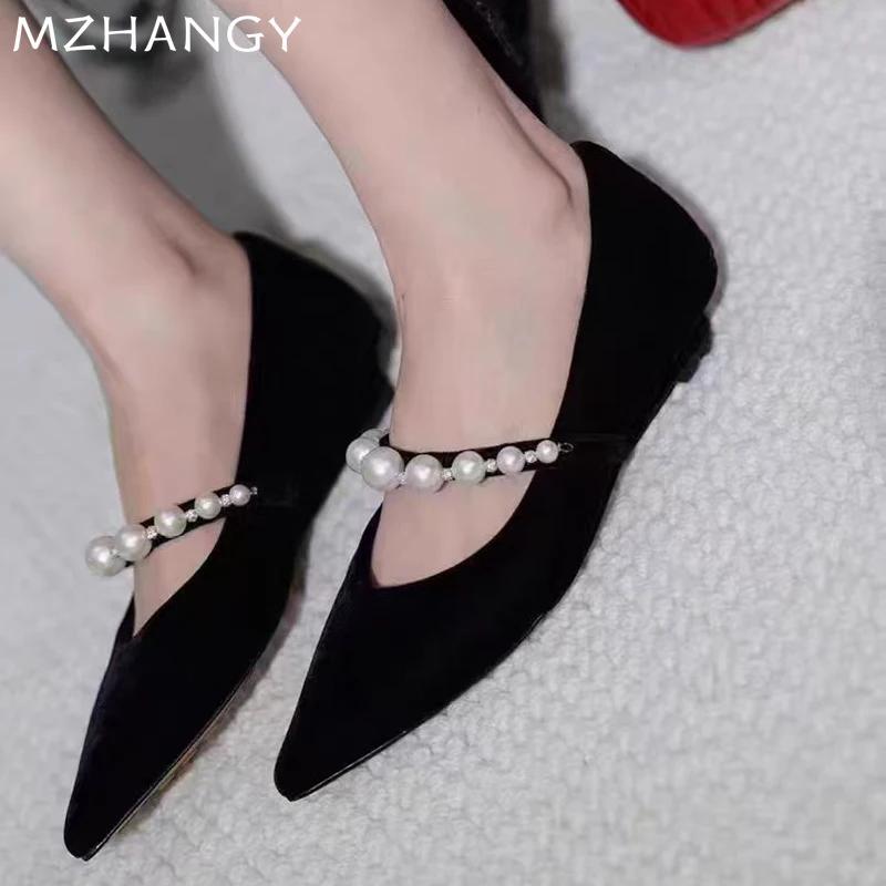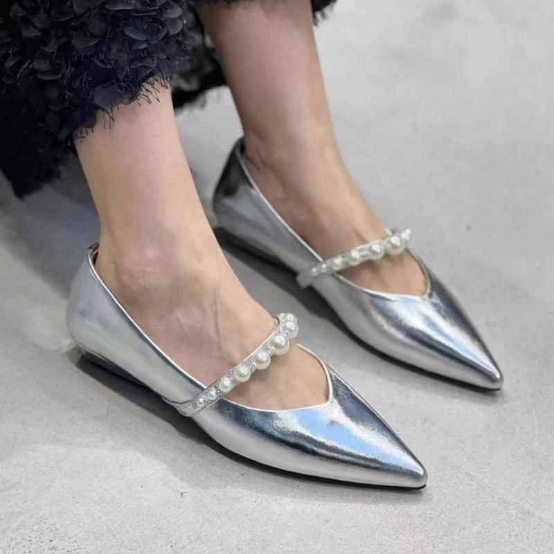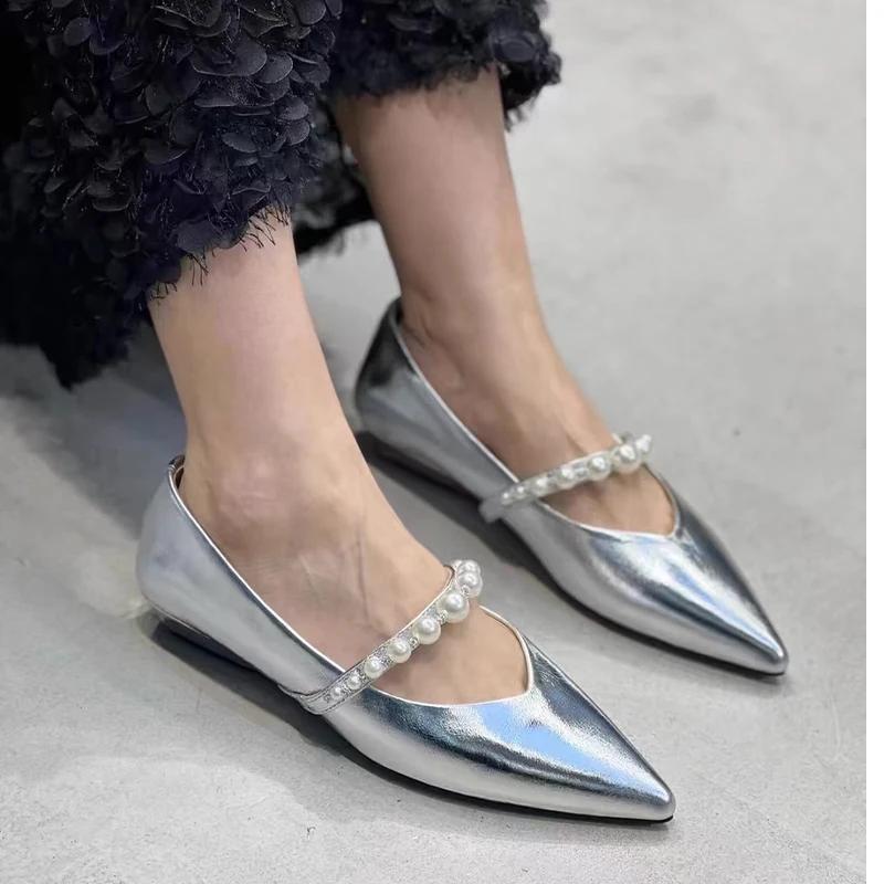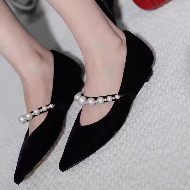 Модные женские туфли-лодочки с острым носком и бисером, плоские, неглубокие туфли Мэри Джейн, женский тренд 2024, зимние роскошные туфли для платья, новые повседневные туфли для женщин