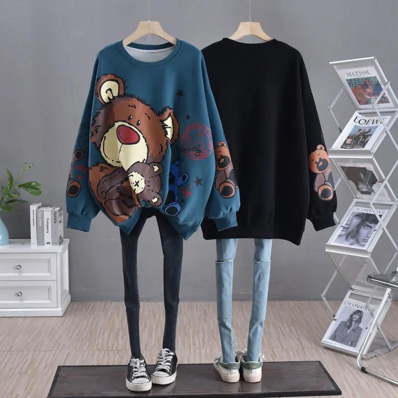 Толстовка женская осенняя, большого размера, с длинным рукавом, свободная, повседневная, топ с мультяшным медведем, повседневный свитер средней длины