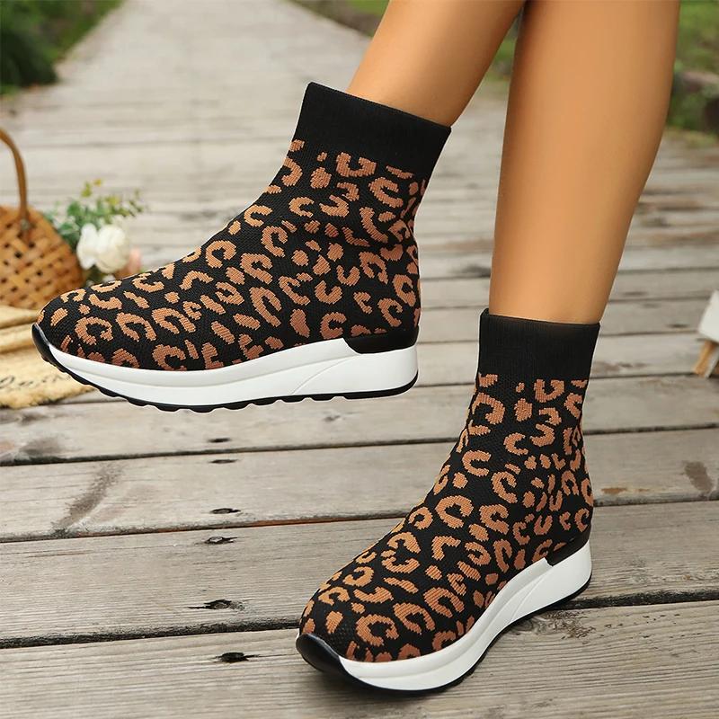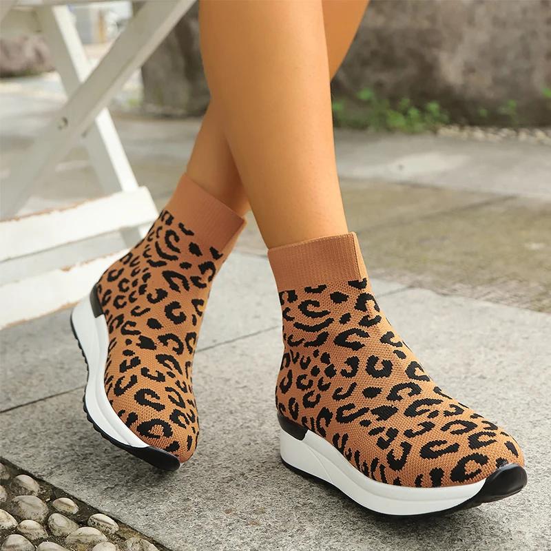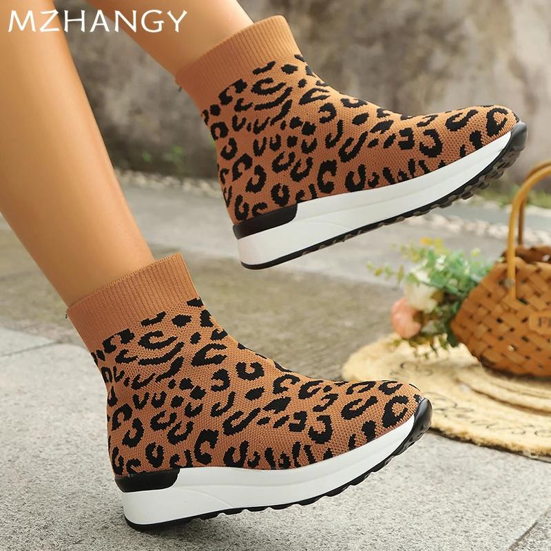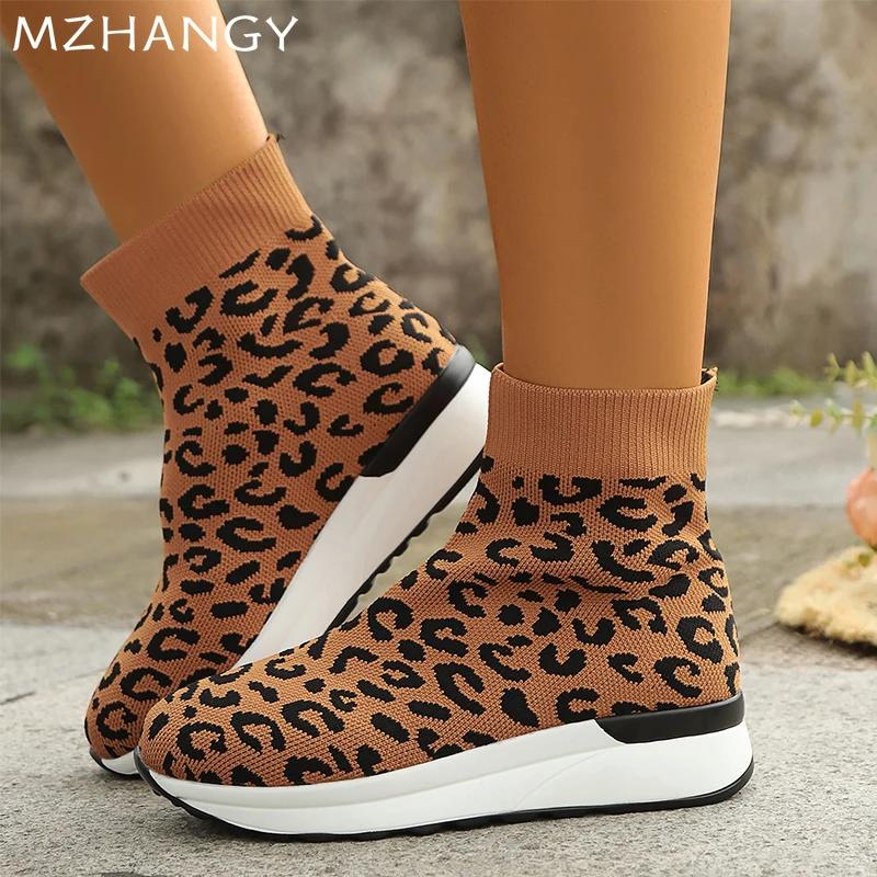 Модные женские ботильоны с леопардовым принтом, ботильоны на плоской подошве, вязаные кроссовки, женская обувь 2025 года, трендовая зимняя повседневная мода, новая удобная спортивная обувь Mujer