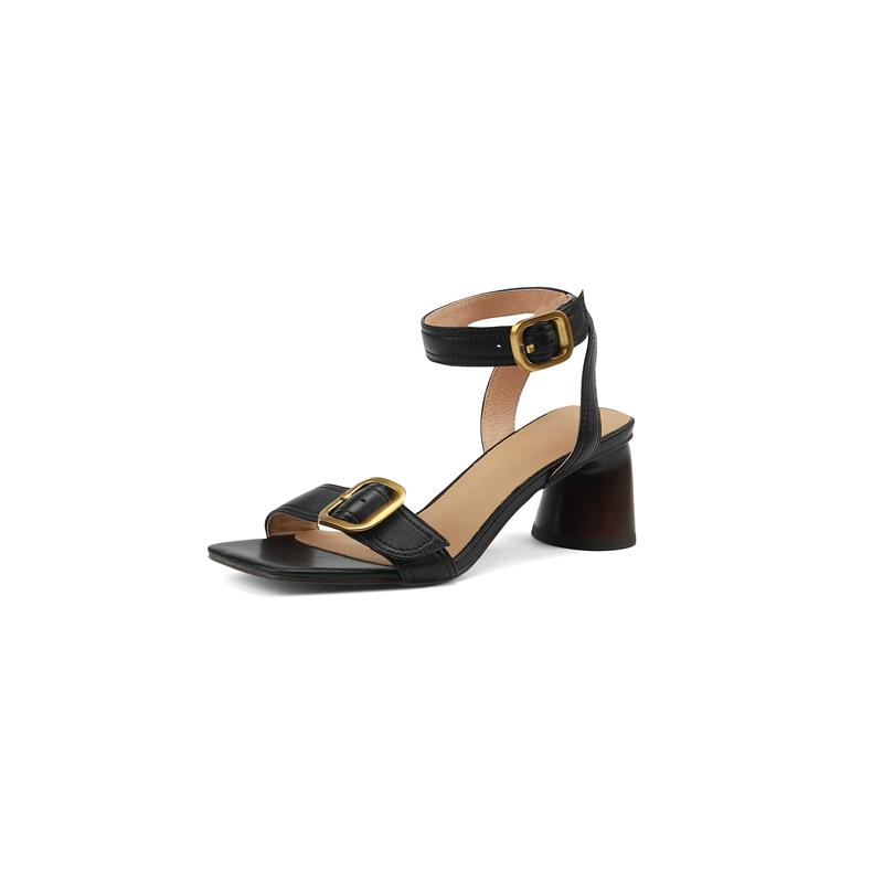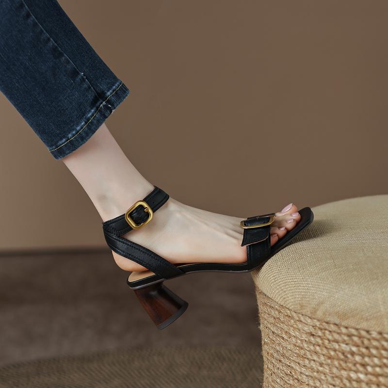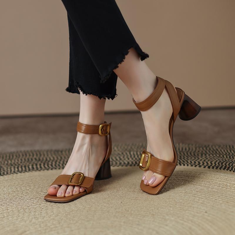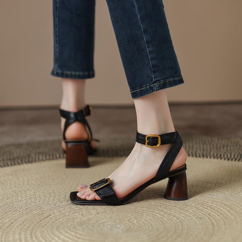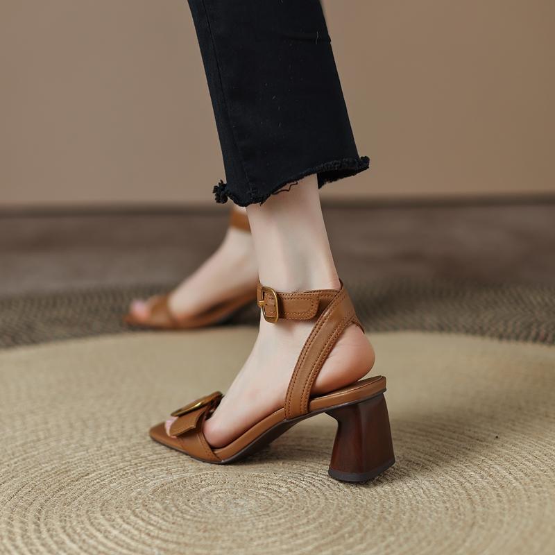 Сандалии женские высшего качества из натуральной кожи с металлическими пряжками на толстом каблуке, туфли-лодочки 2024 года, летние офисные туфли для женщин и вечеринок, женские сандалии