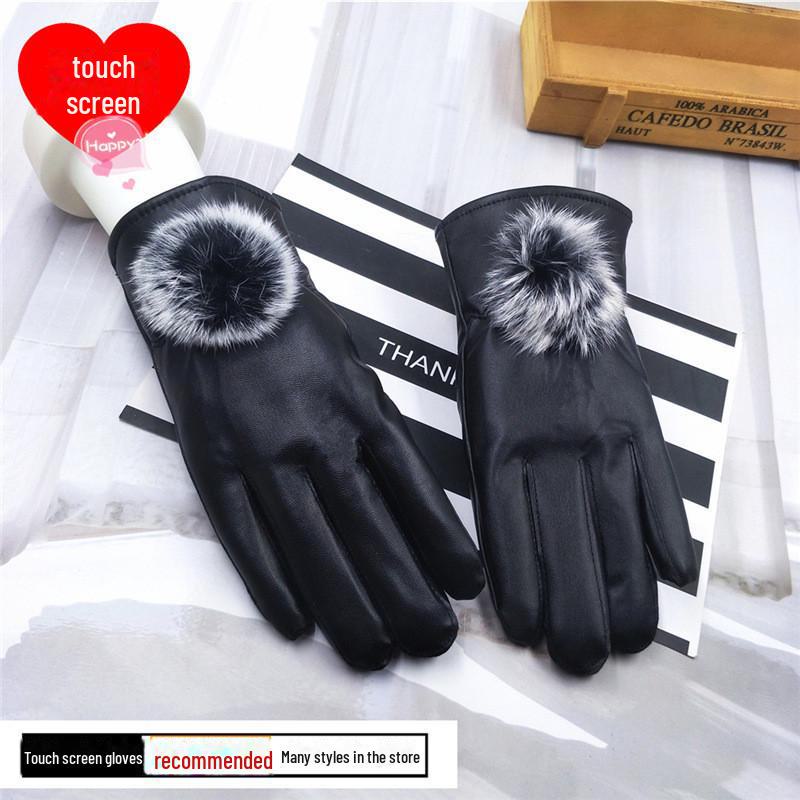 Женские черные бархатные перчатки из искусственной кожи с сенсорным экраном и помпонами из кроличьего меха
