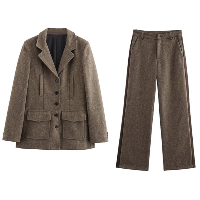 Женский универсальный винтажный тонкий костюм, комплект из двух предметов, осень-зима, однобортный пиджак с длинными рукавами и лацканами, прямые брюки
