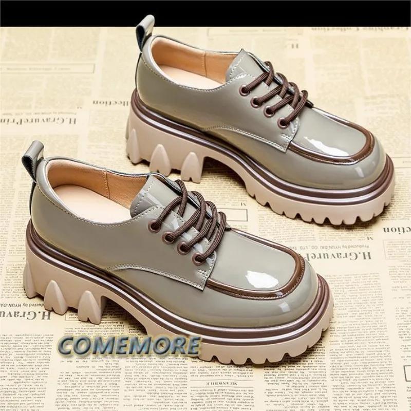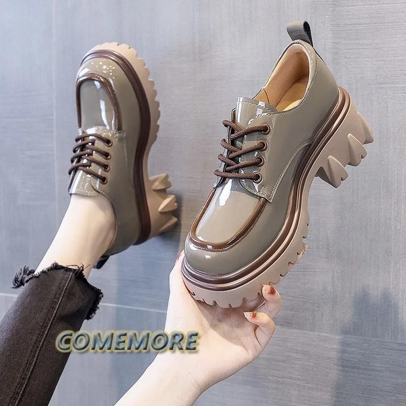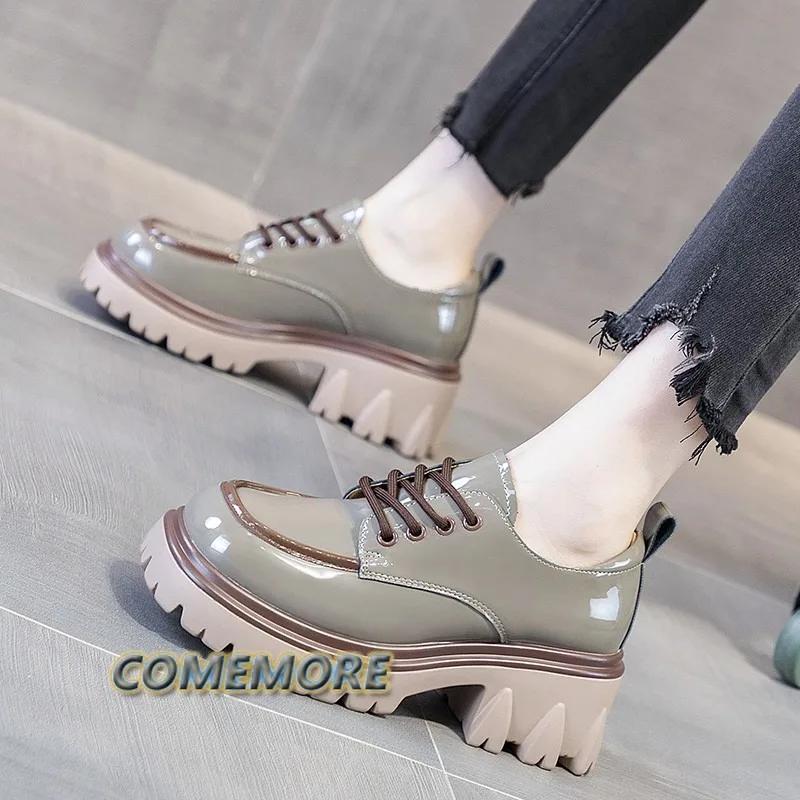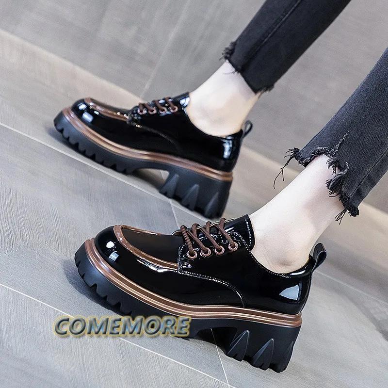 Модные туфли из искусственной кожи для женщин в британском стиле 2024 года, новые весенне-осенние модные туфли на толстом каблуке, платформе, повседневные, с круглым носком, на шнуровке, удобные