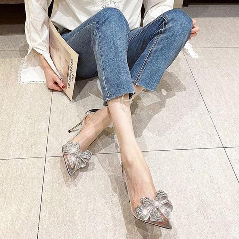Модные осенние новые остроконечные женские туфли-лодочки с кристаллами и стразами, прозрачные сексуальные женские босоножки на высоком каблуке с бантом-бабочкой, модные женские туфли на каблуках