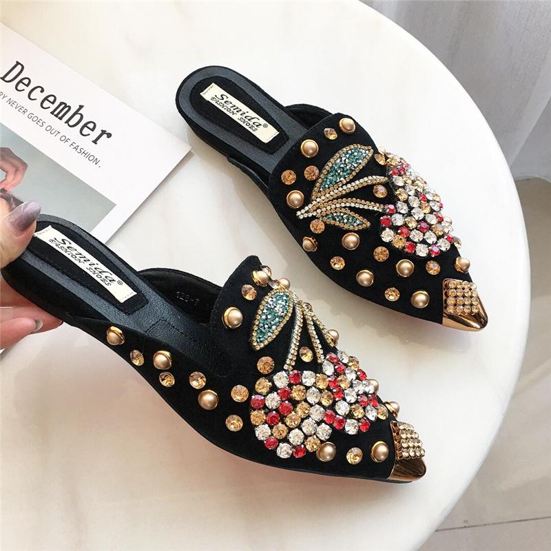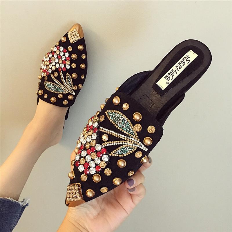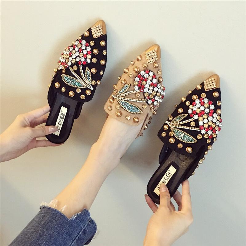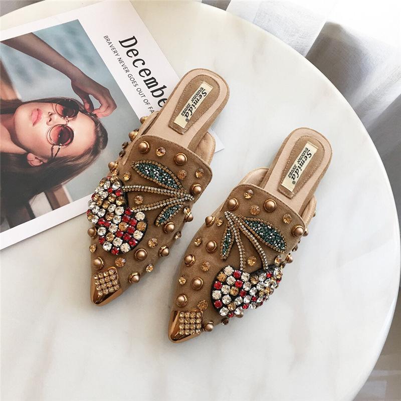 Мода 2025 года, новые туфли для женщин, роскошные тапочки для девочек, повседневные сандалии на плоской подошве со стразами и вишневыми заклепками, каблуки для девочек, острые носки, шлепанцы