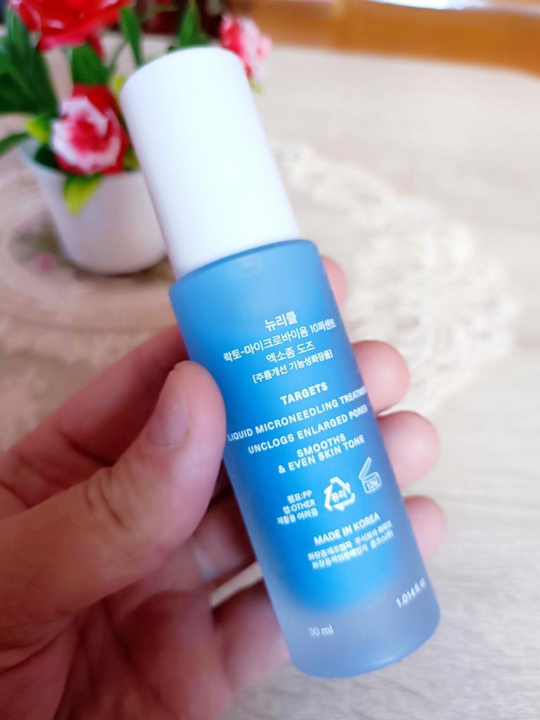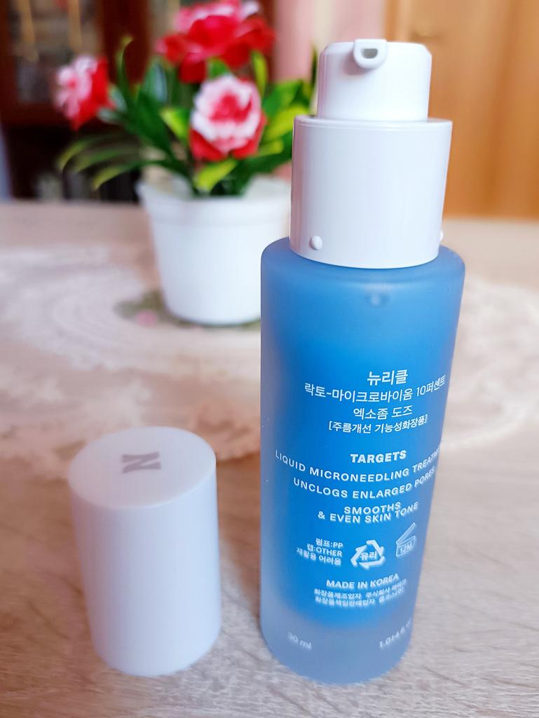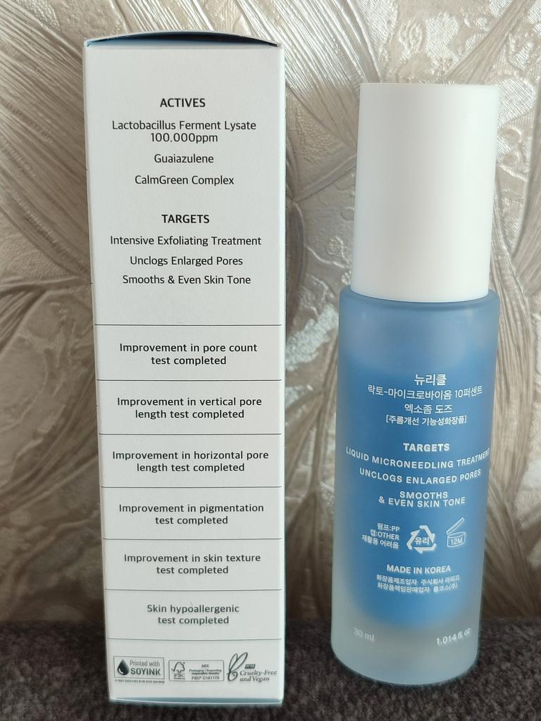 Волшебная сыворотка микронидинг Lacto-Microbiome от корейского бренда NURICLE. Продукт обогащен высокой концентрацией микробиомных экзосом и микроиголок. Эта уникальная формула стимулирует факторы роста клеток кожи, способствуя обновлению кожи, улучшая текстуру кожи и уменьшая поры. Средство в стеклянном флаконе с дозатором, удобно и красиво, упаковано в коробочку Срок годности до 01.07.2027 г. Объём 30 мл. Средство насыщенного голубого цвета, практически без запаха. Средней густоты, хорошо распределяется по коже и очень быстро впитывается, не оставляя на коже липкости и плёнки. После нанесение ощущается лёгкое покалывание микроиголок, которое совершенно не доставляет какого-либо дискомфорта. Эффект от использования просто "ВАУ"! Сыворотка значительно уменьшает поры и улучшает текстуру кожи благодаря технологии микроиголок. Делает кожу сияющей, гладкой и упругой, восстанавливает баланс полезных бактерий на поверхности кожи. Помогает бороться с акне и различными изъянами кожи. Высококонцентрированные экзосомы микробиом: выделены из микробиом человека, они активно взаимодействуют с полезными бактериями на коже. «Микроиглы» проникает глубоко в поры, улучшая структуру и жизненную силу кожи, а также доставляя активные ингредиенты непосредственно к коже, способствуя регенерации, увлажнению и успокоению. Основные преимущества: Глубокое отшелушивание кожи и удаление мертвых клеток кожи. Очищает поры и уменьшает их размер. Улучшает текстуру кожи, делает ее более мягкой и гладкой. Выравнивает тон кожи и уменьшает появление темных пятен. Глубокое увлажнение и успокоение кожи. Как использовать: После очищения кожи нанесите необходимое количество сыворотки на лицо и шею. Нежно массируйте до полного впитывания. Используйте утром и вечером для достижения наилучших результатов. Для чувствительной кожи лучше использовать 2-3 раза в неделю. На следующий день после использования, лучше наносить солнцезащитный крем. Примечание: Вы можете почувствовать легкое покалывание во время нанесения продукта, что является абсолютно нормальным явлением. Интенсивность покалывания может изменяться в зависимости от типа и состояния кожи. Я в восторге от этого продукта, цена высокая, но вполне оправдана, салонный уход в домашних условиях с wow-эффектом.