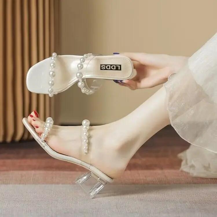 Сандалии для женщин, летние, новые модные женские туфли с открытым носком и прозрачным жемчужным каблуком, женские повседневные шлепанцы Sandalias De Mujer