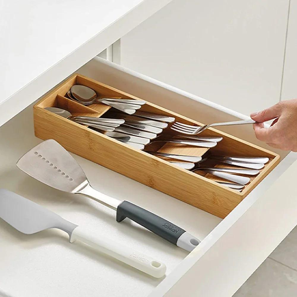 Органайзер для ящиков для кухонных столовых приборов из бамбука, расширяемый, компактный, для столовых приборов, ящик для вилок, ложек, принадлежностей, коробок, просто