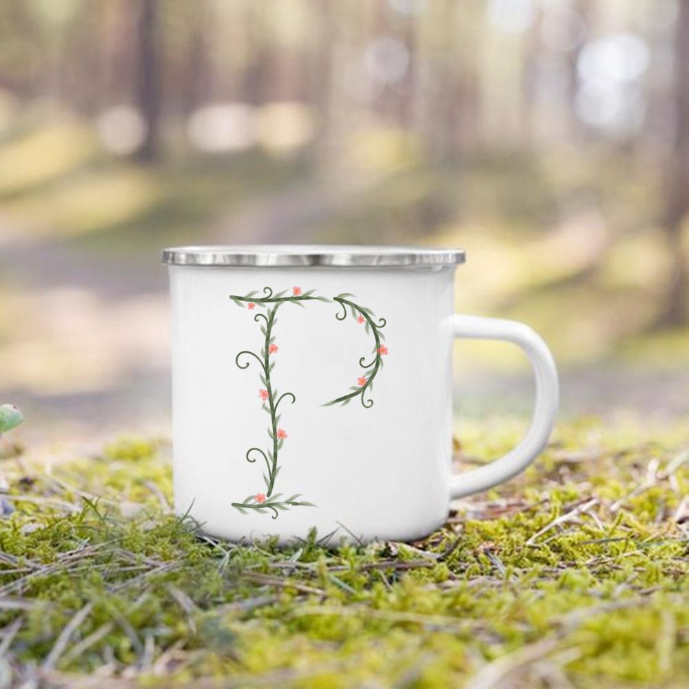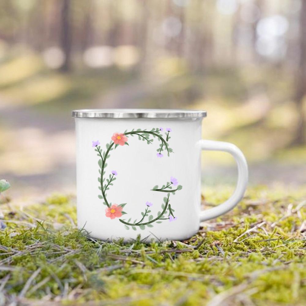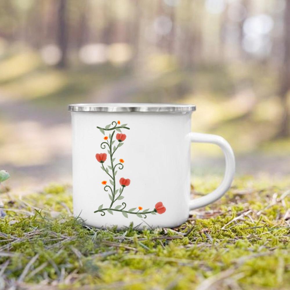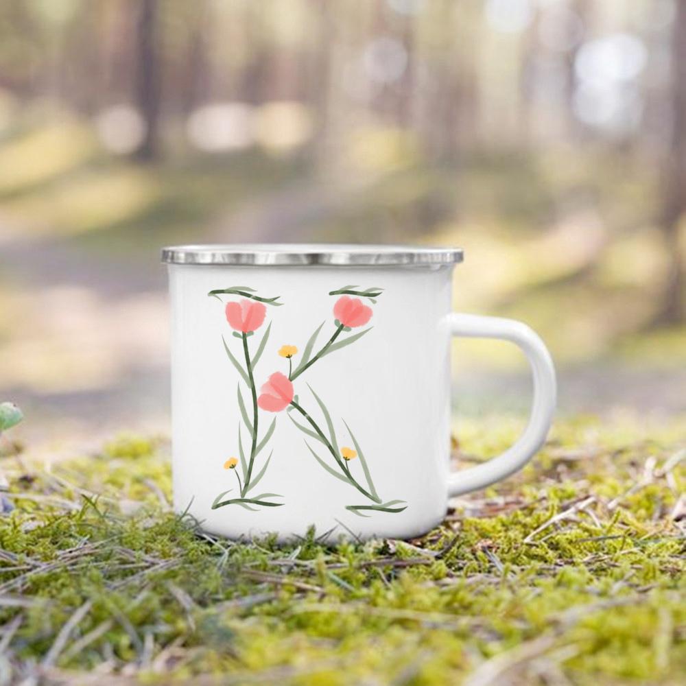 Эмалированная чашка с цветочным алфавитом и ручкой для кемпинга, кружки для кофе и чая, праздничные кружки для дня рождения, кемпинга, костра, лучшие оригинальные и забавные подарки