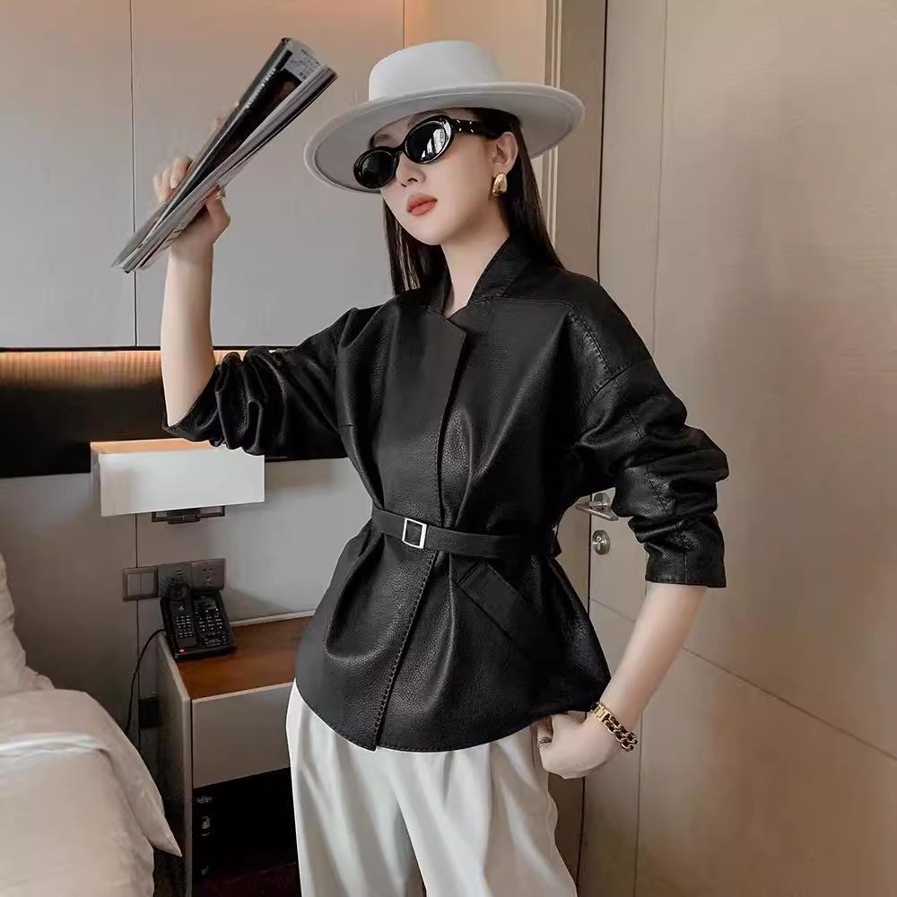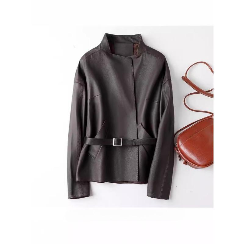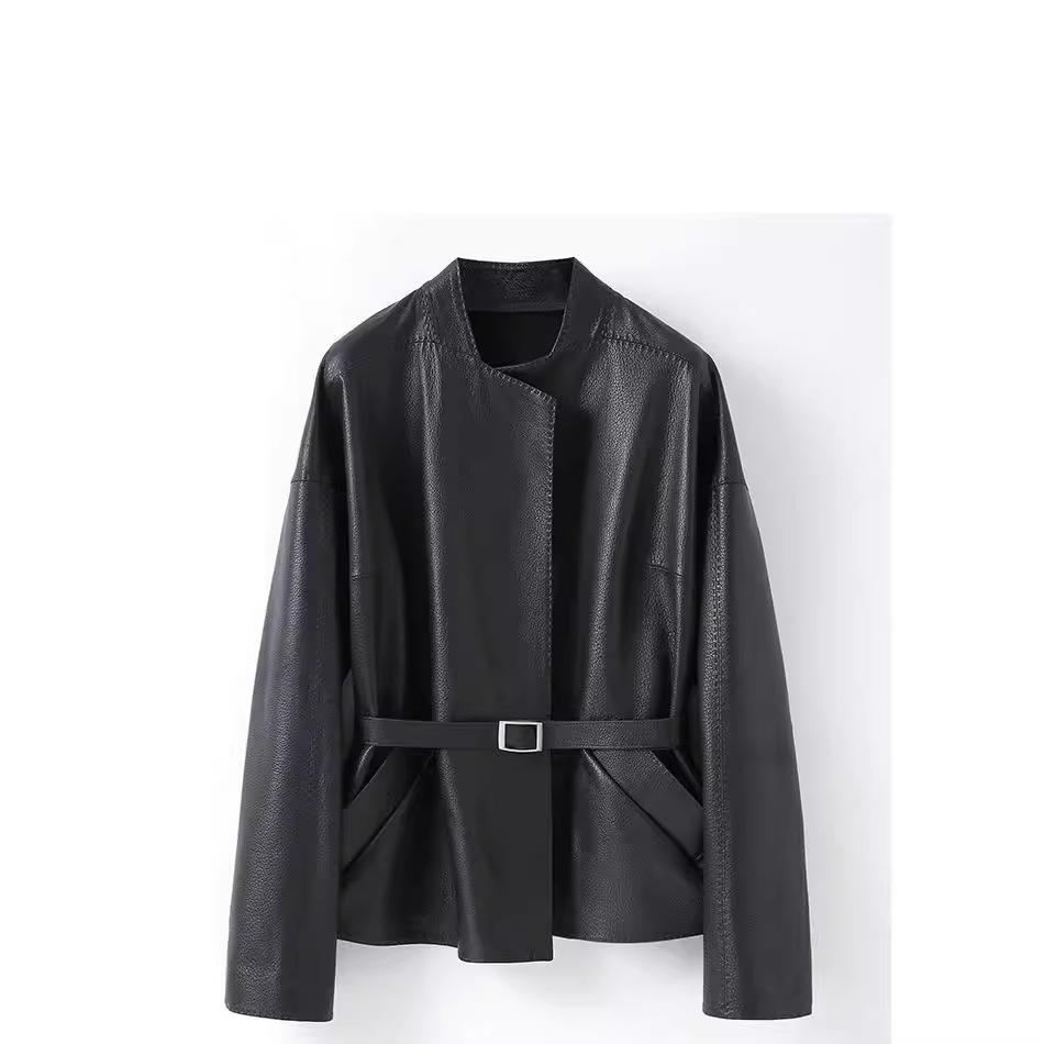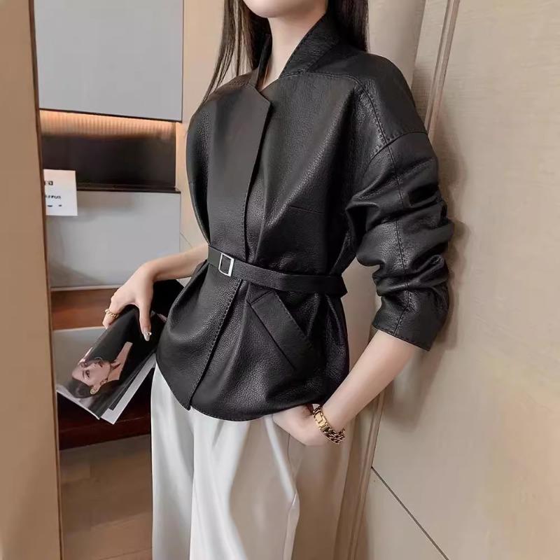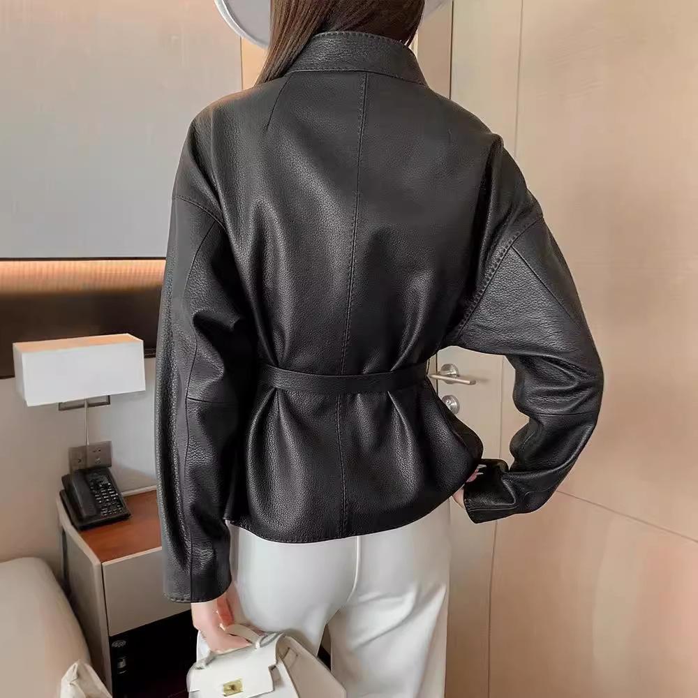 Осеннее пальто из овчины с шагреневой отделкой, женственная короткая кожаная куртка