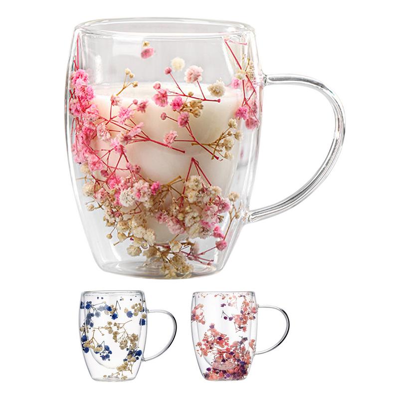 Креативная стеклянная кружка с двойными стенками, кофейная кружка с настоящим сухоцветом, чашка из боросиликатного стекла с ручкой, декор ручной работы, подарки