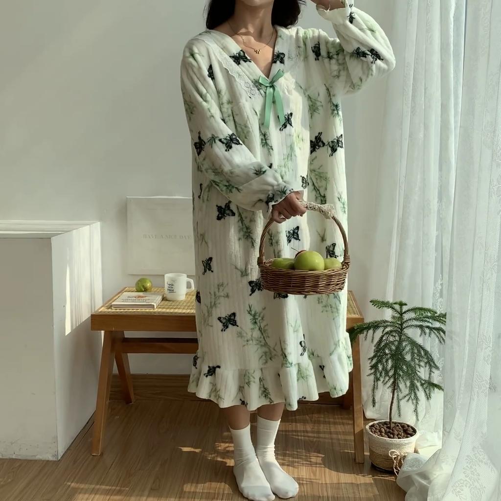 Осенне-зимние ночные рубашки и пижамы с принтом бабочек и кружевом, для молодых девушек, теплая фланелевая ночная рубашка с длинным рукавом, женская одежда для сна, повседневная свободная домашняя одежда — купить товар онлайн с бесплатной доставкой до всему миру!