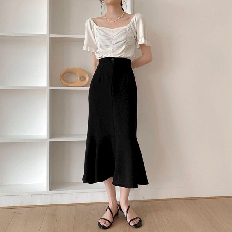 Юбка-рыбий хвост с оборками для женщин, весенняя элегантная юбка А-силуэта с высокой талией, средней длины, черная, винтажная женская одежда