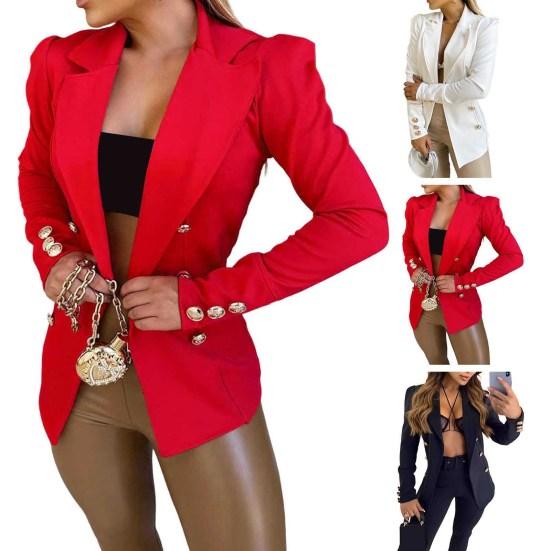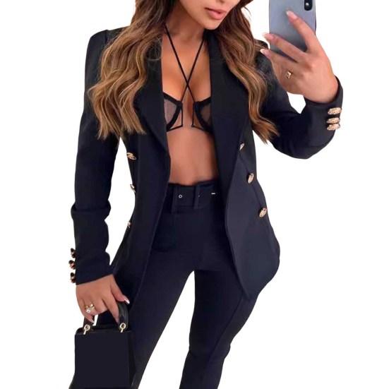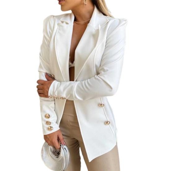 Универсальная элегантность: Ощутите простоту и изысканность с помощью женского базового пиджака однотонного дизайна с классическими лацканами.. Узкий силуэт с длинными рукавами, украшенный пуговицами, гармонично сочетает в себе вневременную привлекательность и современные модные тенденции.