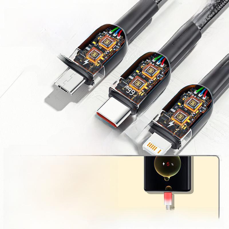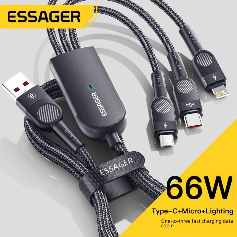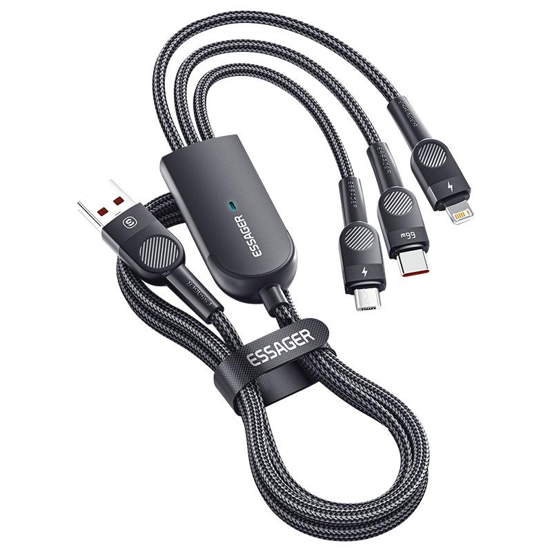 ESSAGER Swift Series 66W Fast Charging Cable: 3-in-1 for Apple, Type-C, and Android Devices.
