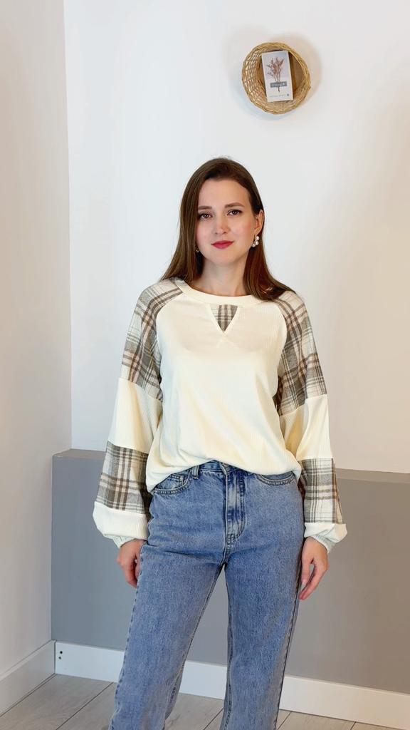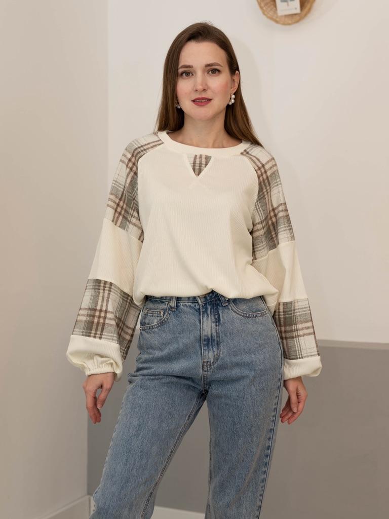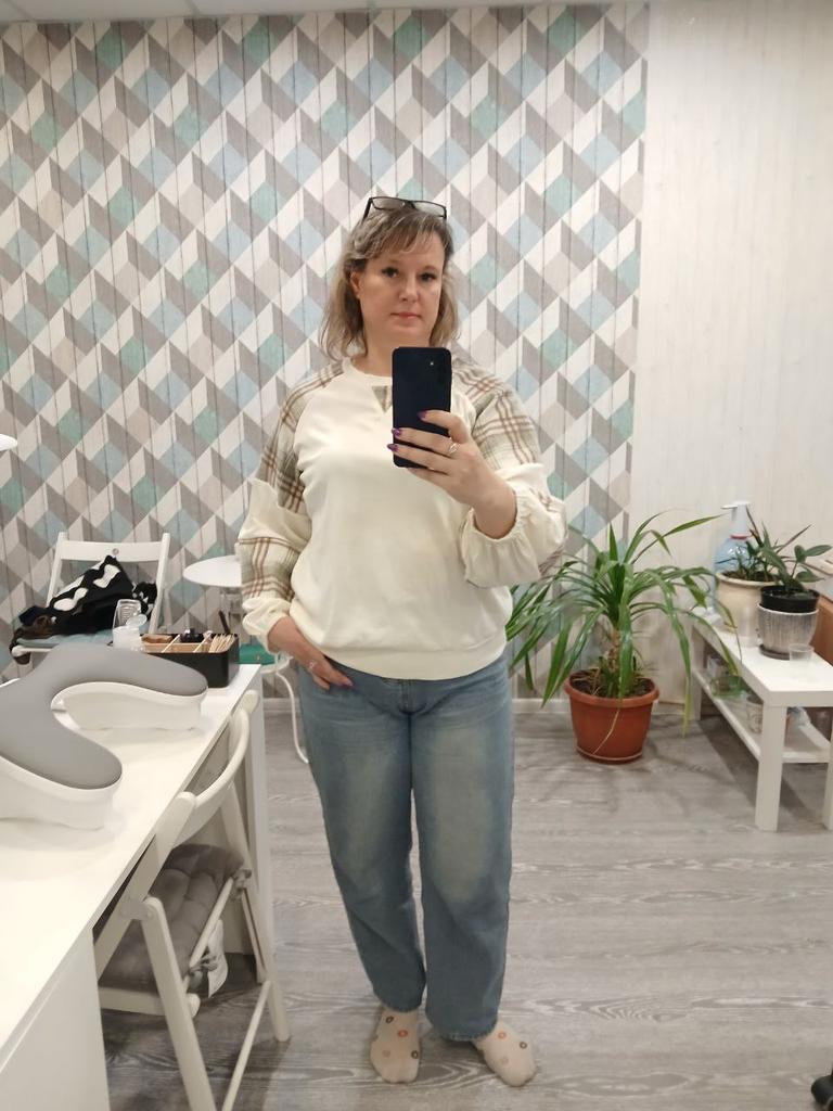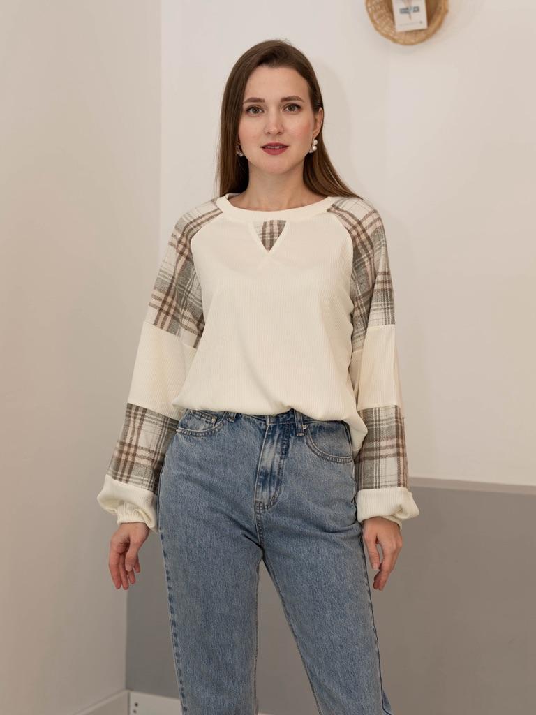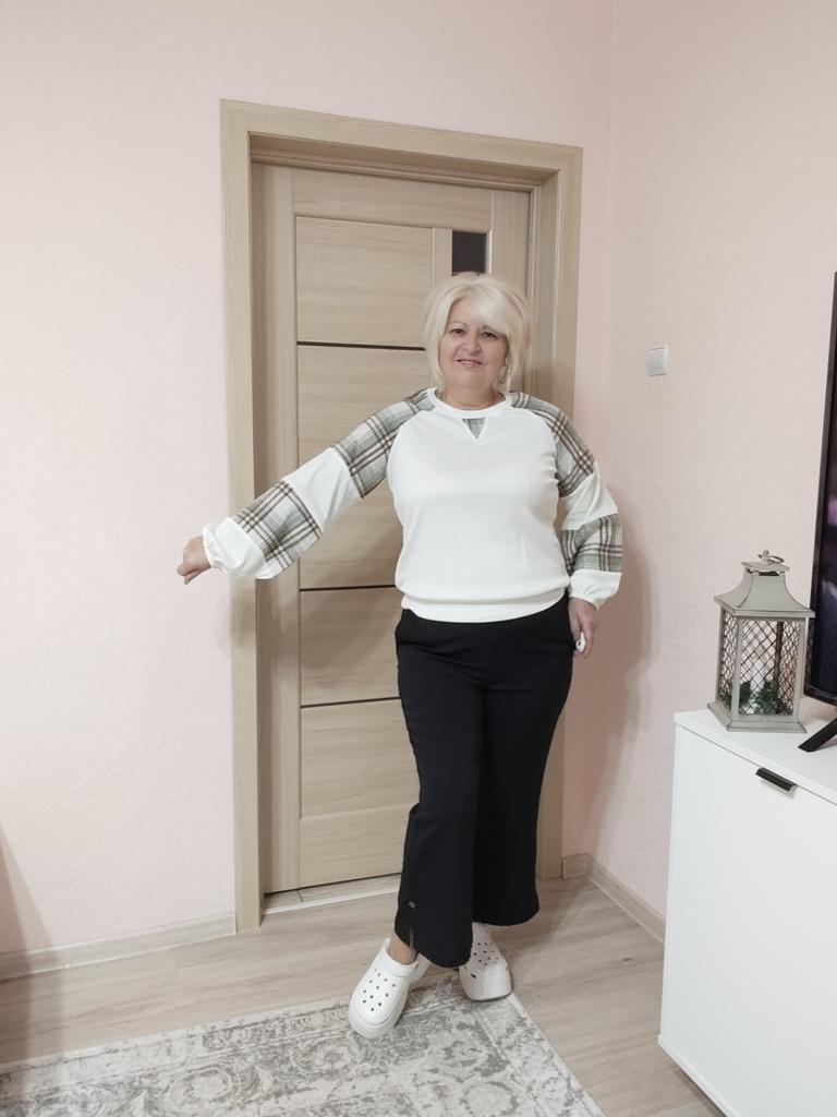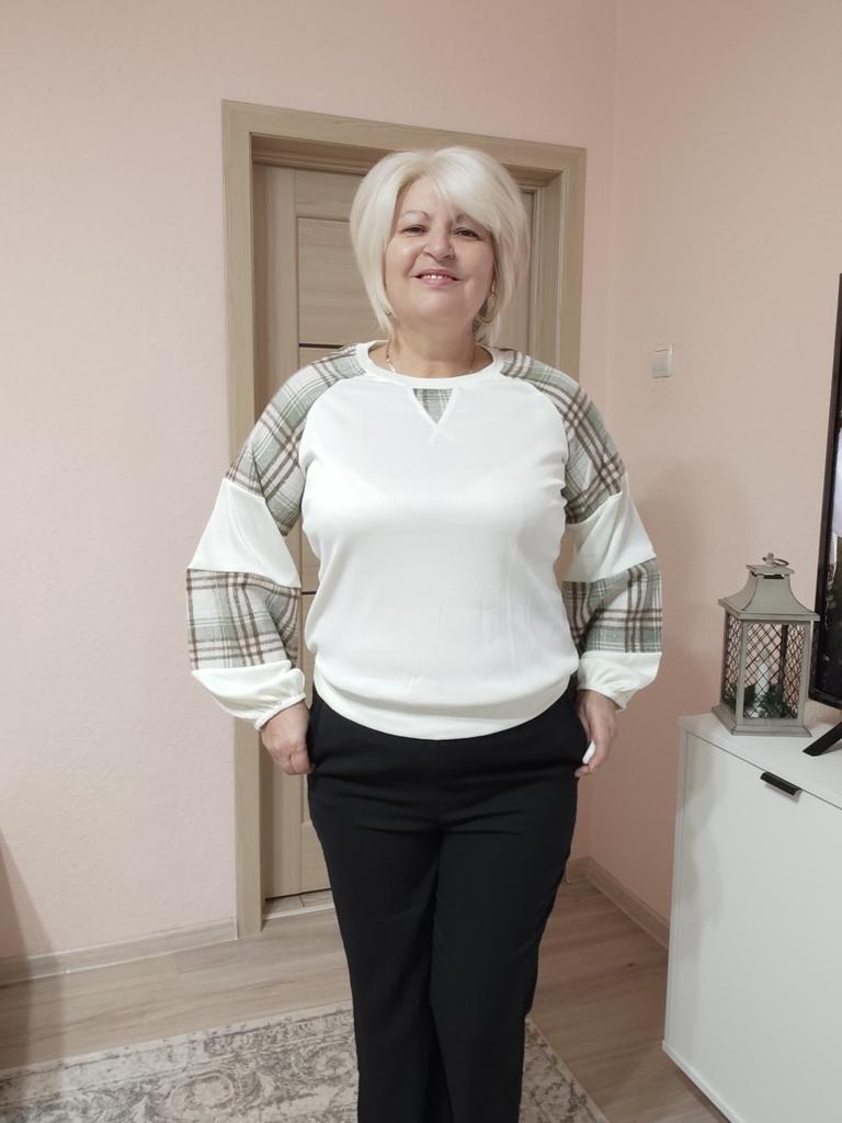 Эта кофточка представляет собой уютный и модный свитшот, который объединяет разные текстуры и узоры. 🔸На выбор размеры: S-XL. На мне М. - Замеры изделия: Длина - 64 см ОГ - 120 см + тянется Длина рукава от горловины - 69 см 🔸Основная часть (перед и спинка) выполнена в светлом, кремово-белом цвете из мягкого, фактурного материала (тонкого трикотажа в рубчик). 🔸Главная особенность — это объемные, широкие рукава, выполненные из контрастных вставок (колор-блокинг): 🔸Большие секции из того же кремово-белого трикотажа. 🔸Вставки из ткани в клетку (тартан) в приглушенной зелено-коричневой гамме. Этот узор добавляет вещи тепла и осеннего настроения. 🔸Свитшот имеет свободный крой с круглым вырезом. Рукава-фонарики завершаются плотными манжетами, которые придают им выразительную форму. Небольшой декоративный V-образный вырез на горловине добавляет аккуратности. Рекомендую 👍 Ставлю ⭐ ⭐ ⭐ ⭐ ⭐ Спасибо продавцу ❤️ и Joom ❤️