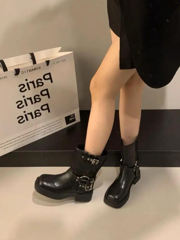 Женские туфли на платформе 2024 года, простые ковбойские сапоги в стиле ретро, квадратный носок, толстый каблук, рыцарские сапоги, мягкая подошва, удобные байкерские ботинки