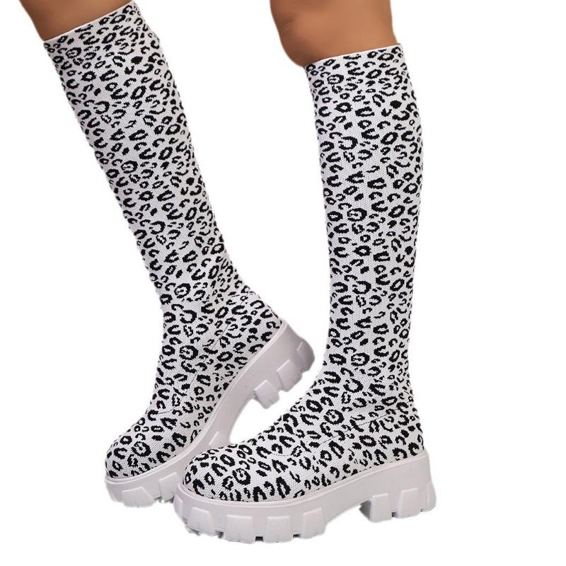 Модные женские сапоги с леопардовым принтом 2024 года, осень, удобные, нескользящие, эластичные, длинные, на толстой подошве, на платформе, большой размер 43, сапоги-носки