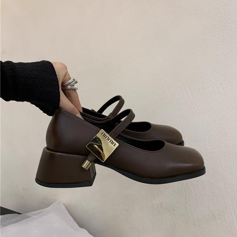 Мода Новые туфли Мэри Джейн Женские туфли Высокий каблук Весна Квадратный носок Средний каблук Сандалии Дизайнерские Неглубокие лодочки Толстая подошва Кожаные туфли 35-39