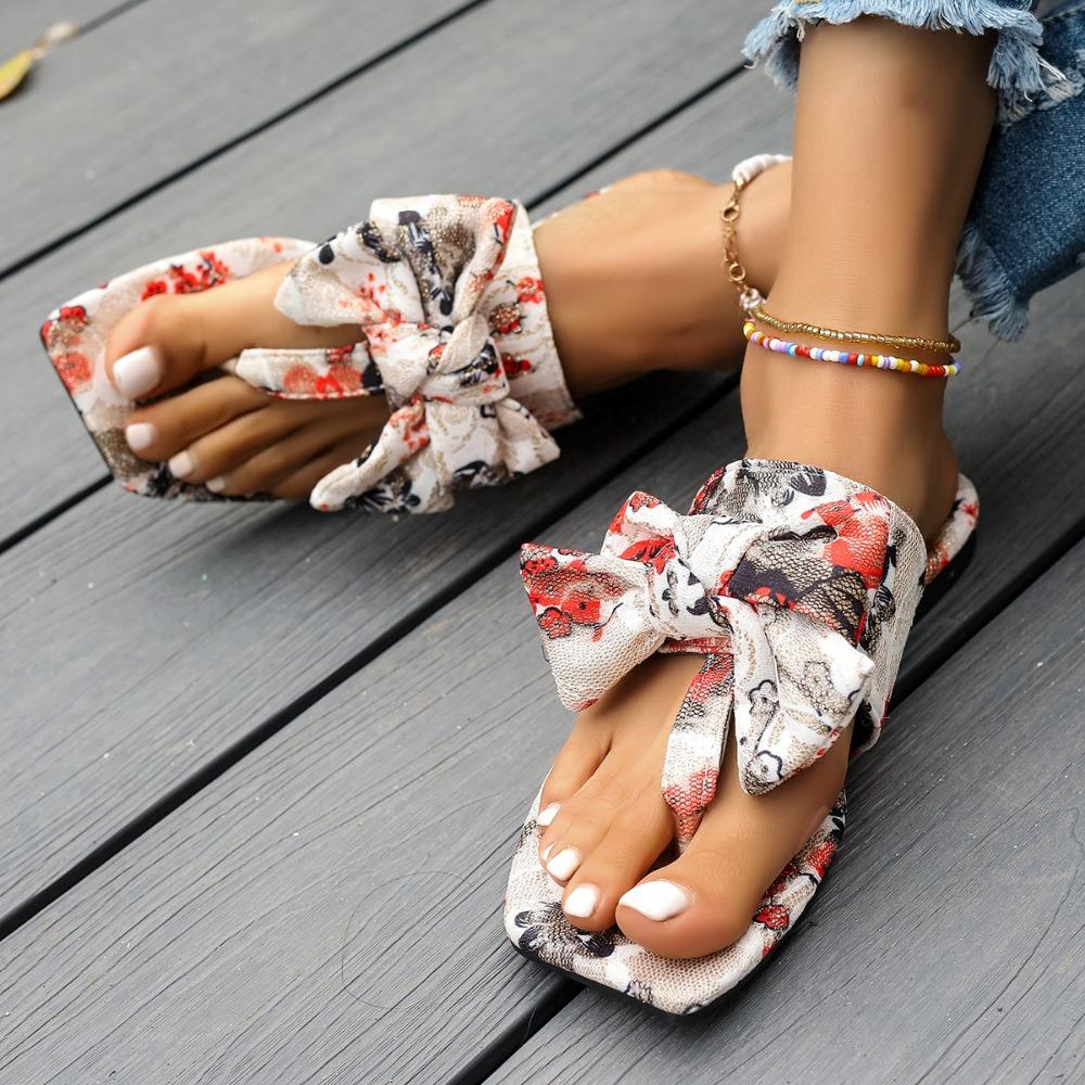 Модные женские летние тапочки 2024 года, новые цветочные сверкающие золотые банты с лентой, модные и удобные тапочки с узором «елочка» на плоском каблуке