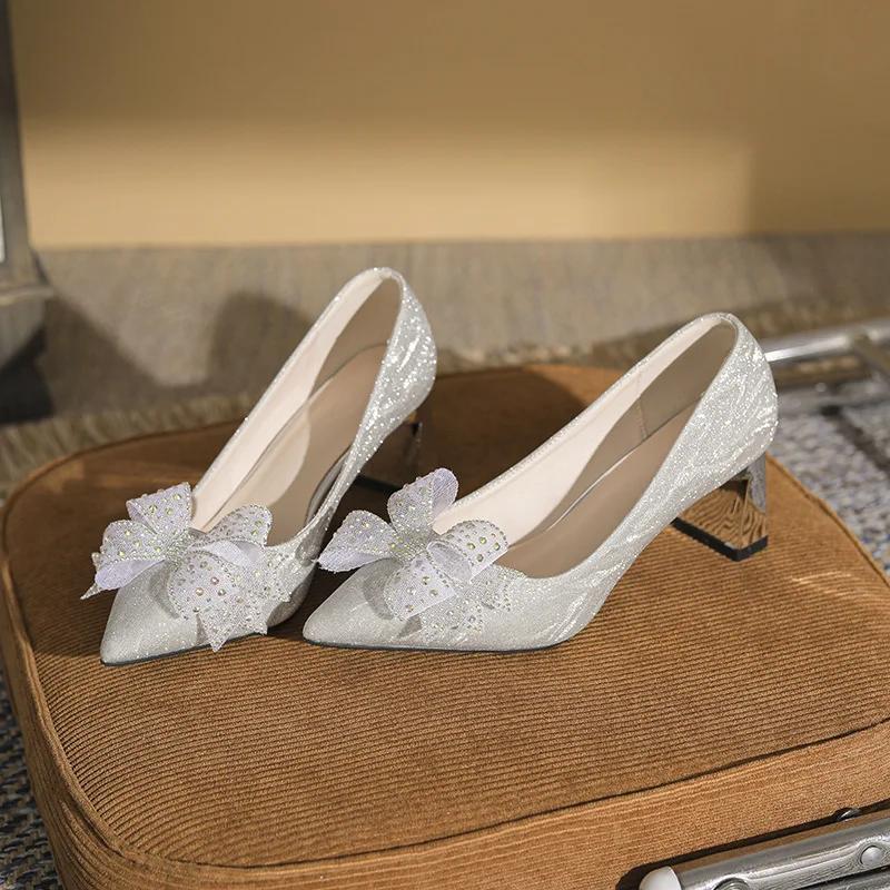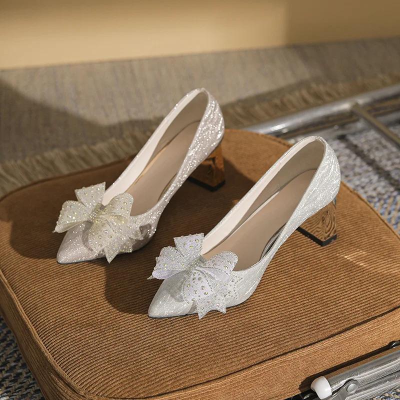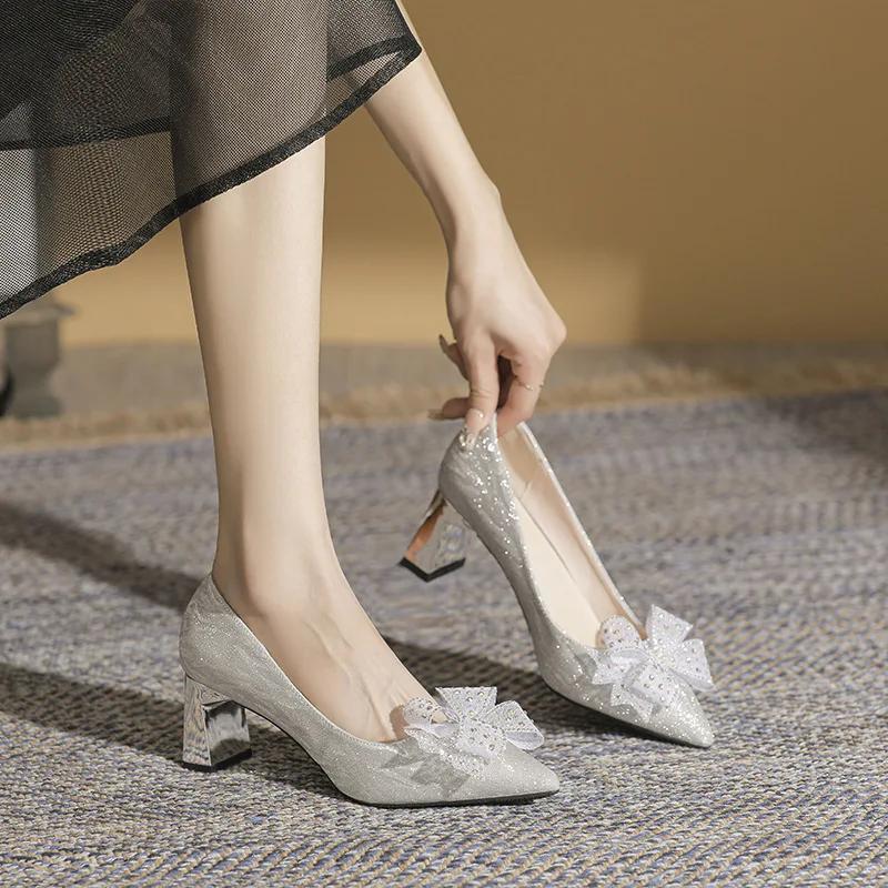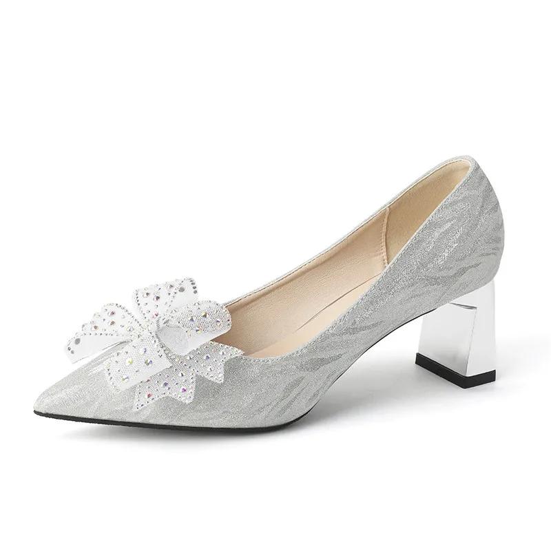 Модные блестящие туфли на высоком каблуке для женщин, весна 2024, новые туфли с бантом и стразами, с острым носком, женские туфли на толстом каблуке, туфли-лодочки Zapatillas Mujer